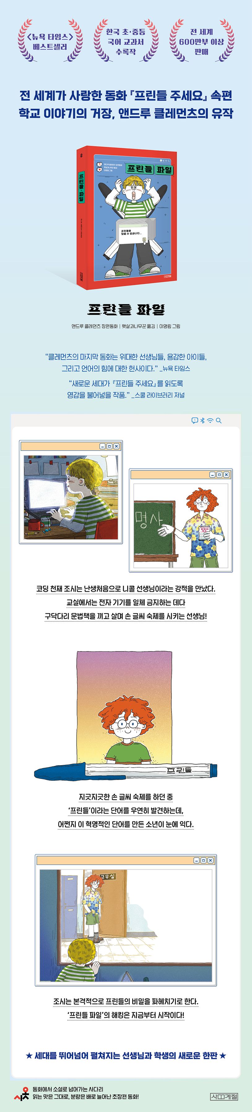 한국에서는 초등, 중등 국어 교과서에 수록되어 수십 년간 사랑받았고, 전 세계에서는 600만부 이상 판매된 전설적인 동화 『프린들 주세요』의 후속작이 25년 만에 출간되었다. 『프린들 파일』은 학교 이야기의 거장 앤드루 클레먼츠가 세상을 떠나기 전 마지막으로 남긴 작품으로, 작가는 빠르게 변해 가는 시대 속에서도 절대 변치 않는 사제 간의 이야기를 다시금 선보여 냈다. 한때 교사였던 앤드루 클레먼츠는 어린이의 일상 속 고민과 갈등을 짚는 유쾌하고 통쾌한 이야기로, 누구보다도 어린이 독자들의 열렬한 사랑을 받았다. 과거 『프린들 주세요』에서 소년 닉과 그레인저 선생님이 ‘프린들’이라는 새로운 낱말을 두고 전쟁 아닌 전쟁을 벌였듯, 『프린들 파일』에서는 현대의 어린이 조시와 구닥다리 니콜 선생님이 전자책과 종이책, 코딩과 글쓰기, 변화와 규칙 사이에서 불꽃 튀는 한판을 벌인다. 컴퓨터로 간단하게 숙제며 취미 활동 들을 하기 좋아하는 조시와 교실에서 전자 기기 사용을 일절 금하는 니콜 선생님의 실랑이는 미국뿐만 아니라, 오늘날 한국 교실, 가정과도 심히 맞닿아 있다.