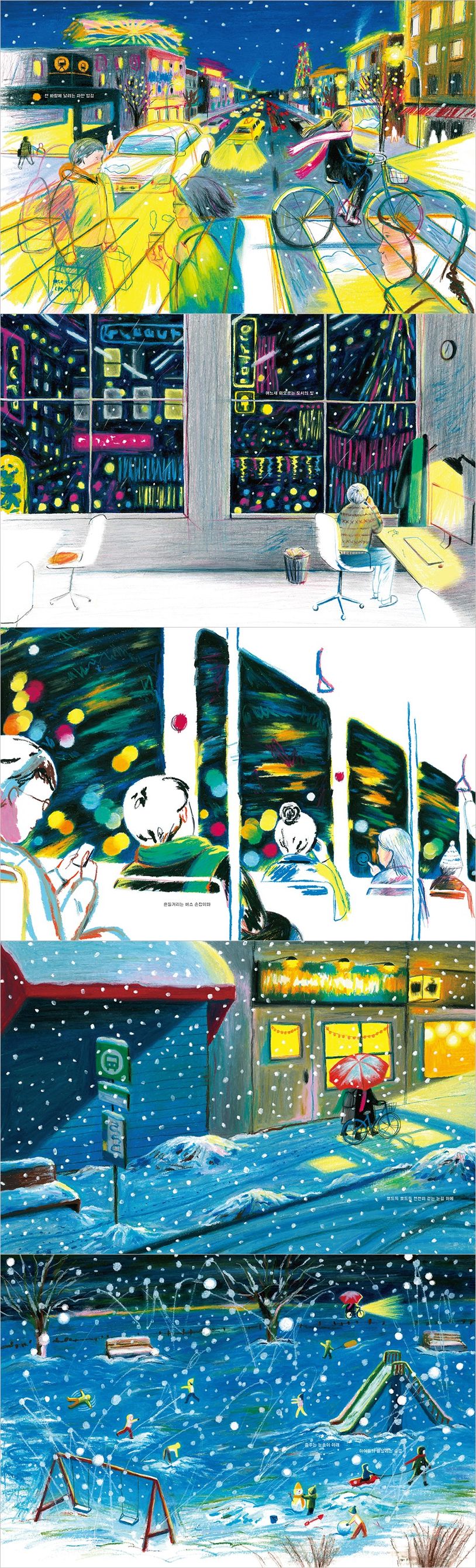 잘 자라고 다정하게 속삭이는 빛 그림책에서 눈발은 변한다. 점점 굵어져서 흩날리다가 함박눈이 되었다가 작은 눈송이가 되어 세상에 내린다. 눈이 내릴수록 세상의 볼륨이 점차 낮아진다. 빛의 수집가인 작가는 겨울을 가만히 들여다본다. 눈길에 남은 발자국에서 어딘가를 향해 걸어가는 무수한 사람들을 상상하는가 하면 정체된 거리에서 자동차 와이퍼 너머 시간이 느릿느릿 흐르는 순간을 포착한다. 우산에 잠시 닿는 눈송이 소리에도 귀를 기울이며 겨울의 시간을 때로는 빠르게 때로는 느리게 흘러가도록 연출한다. 겨울이라는 이름의 시집을 천천히 아껴 읽자고 말하듯이 이 계절을 풍부하게 음미해 보자고 권한다.