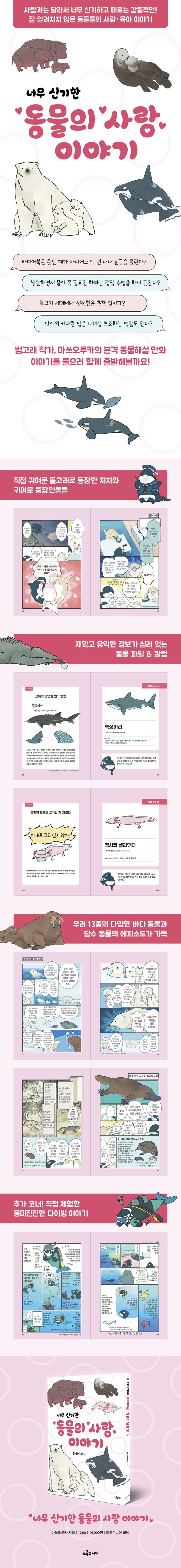 이 책은 바다 동물과 담수 동물의 사랑 이야기를 만화와 글로 소개하는 책입니다. 범고래, 상어, 곰치부터 해달, 바다코끼리, 북극곰까지… 무려 13종의 동물들이 나와서 연애부터 육아까지의 과정을 상세하게 보여주죠. 저자 마쓰오루카는 범고래를 너무 좋아해서 이 책에서는 범고래가 되어서 등장하는데, 나중에는 직접 체험한 다이빙 이야기를 들려주기도 한답니다.