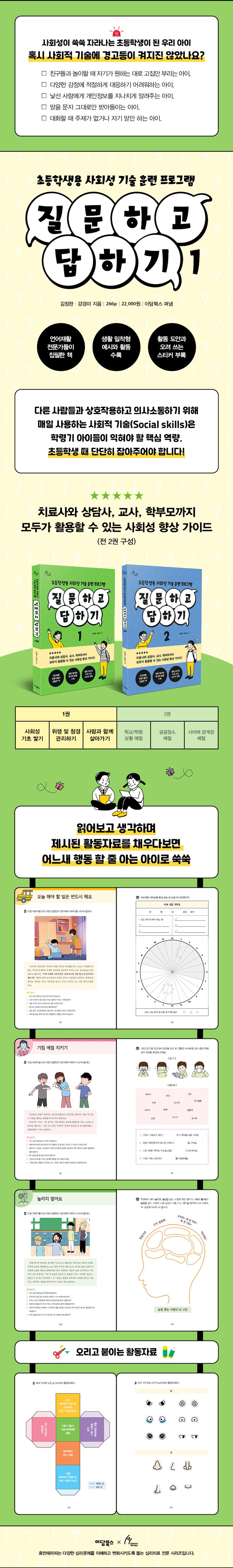 초등학교는 아이가 사회생활 첫걸음을 떼는 곳이다. 만약 때와 장소와 상황에 맞게 행동하기 어려워한다거나, 부모님, 선생님, 친구들과 소통하는 데 어려움이 있다면 〈질문하고 답하기〉로 사회적 기술을 익혀보자. 6가지 파트에 걸쳐 제시된 다양한 상황을 읽어보고 생각하고 활동자료를 채우다보면 경우에 알맞은 행동을 할 줄 아는 아이로 부쩍 성장할 것이다. (전 2권으로 구성된 도서 중 첫 번째 책입니다.)