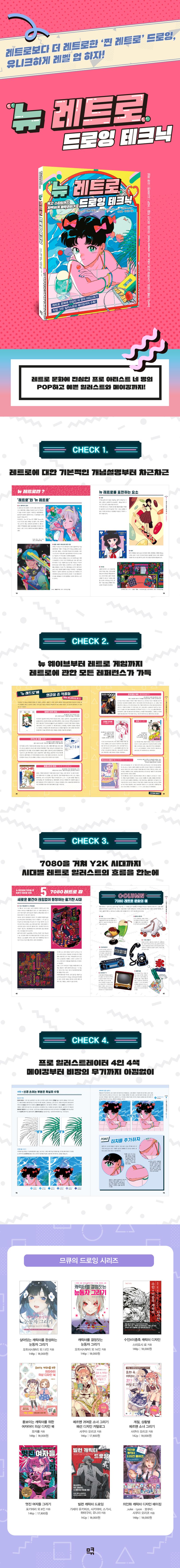또한, 레트로 그림뿐만 아니라 게임, 음악, 7080, 팬시 문화에 대한 내용도 담겨 있다. 학창 시절에 자주 들러 아기자기한 소품을 샀던 ‘팬시점’의 기원이 어디에서 출발했는지도 확인할 수 있으며, 이렇게 우리 일상에 만연한 레트로의 흔적들을 되짚어 만나볼 수 있다. 어떤 패턴이나 배경을 사용해야 레트로 스타일 일러스트와 잘 어울리는지 등의 정보를 통해 레트로보다 더 레트로한 ‘뉴 레트로’의 세계로 나아갈 수 있도록 책을 구성했다. 팝하고 예쁜 일러스트도 가득하니 기대하기를 바란다!