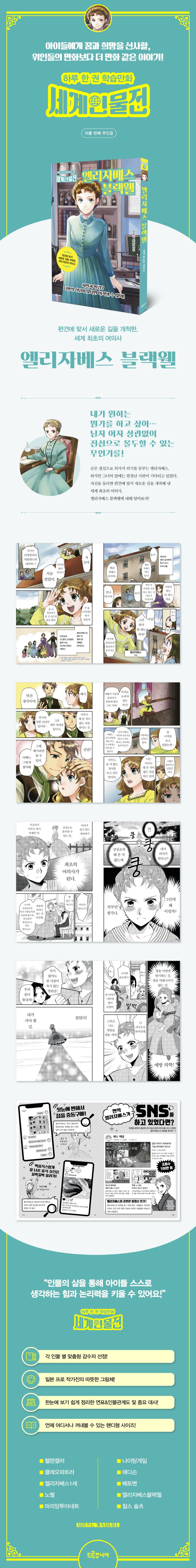〈세계인물전〉, 그 아홉 번째 여정의 주인공은 ‘엘리자베스 블랙웰’이다. 그녀는 여성이 결혼을 하고 가정을 이루는 것이 당연했던 시대에, 자신을 둘러싼 편견에 맞서 새로운 길을 개척했다. 그렇게 엘리자베스는 ‘세계 최초의 여의사’가 되었다. 하지만 그녀가 세계 최초로 여의사가 되었다는 사실보다 중요한 것은, 그녀가 자신을 둘러싼 편견과 차별을 어떻게 극복해냈는가에 있다. 엘리자베스가 살았던 시대는 여성 차별뿐만 아니라 노예제도가 존재했던 시대였고, 그녀의 아버지는 미국에서 노예제 폐지 운동에 참여했다. 인간에 대한 차별에 저항하는 아버지를 두었던 엘리자베스. 그런 그녀는 모두가 불가능하다고 말하는 자신만의 꿈을 위해 끊임없이 좌절했고, 끊임없이 일어났다. 그 모든 일이 과연 혼자만의 힘으로 가능했을까? 결코 그렇지 않다고 그녀의 삶은 말한다. 그녀의 이야기는 차별과 편견, 낡은 사고방식과 맞서 싸운 기록이며, 동시에 가족의 유대감을 그린 이야기다. 여기에 초점을 맞춰 이야기를 읽어간다면, 엘리자베스가 주는 긍정적인 힘과 함께, 예상치 못한 감동까지 얻어갈 수 있을 것이다.