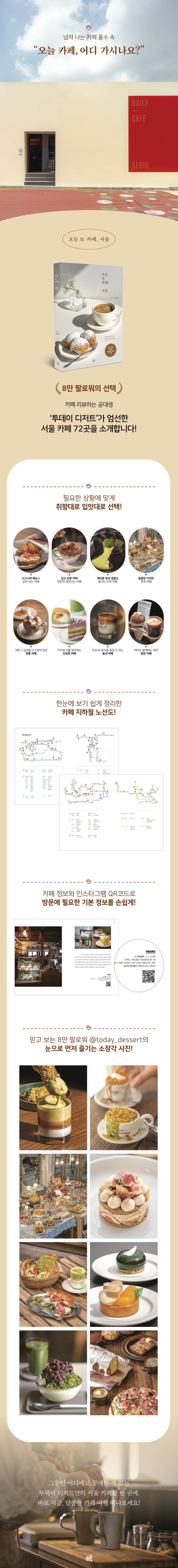 이 책은 8만 팔로워의 선택을 받은 카페를 사랑하는 공대생 ‘투데이 디저트’가 엄선한 서울 카페 72곳을 소개한다. 카페 공화국 대한민국에서 오늘 갈 카페를 고르는 일은 어렵다. 하루에도 수십 개의 카페가 문을 열고 닫는 지금, 그중에서 요즘 사람들의 사랑을 받고 있는 카페를 골라 선보인다. 〈오늘 또 카페, 서울〉에서는 시그니처 카페, 에스프레소 카페, 이색 카페, 디저트 카페, 전통 카페, 비건 카페, 동네 카페, 애견 동반 카페까지 총 8가지 상황에 맞게 내 입맛대로 카페를 골라 갈 수 있도록 했다. 또, 카페 72곳 지하철 노선도를 함께 수록했으니 이 책과 함께라면 매일매일 달콤한 카페 여행을 떠날 수 있다.