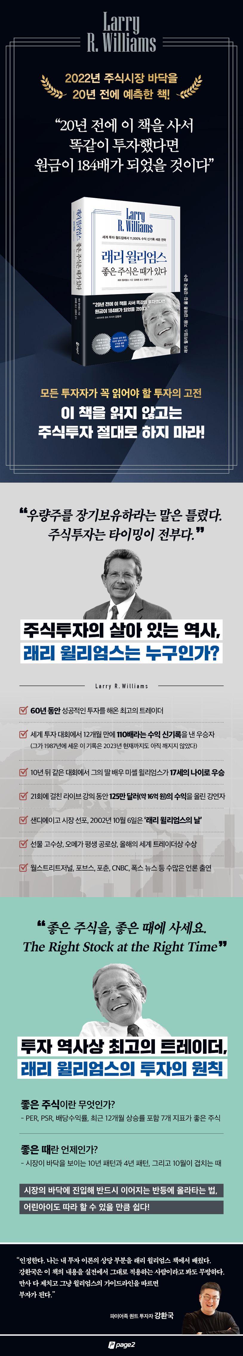 지금부터 무려 20년 전에 출간된 책이 현재의 상황을 정확하게 맞추었다면 믿어지는가? 믿어지지 않겠지만, 이는 사실이다. 2003년에 처음 출간된 이 책은 2022년 10월 미국 주식시장의 바닥을 정확히 예측했다. 이 책의 저자 래리 윌리엄스는 60년 동안이나 성공적인 투자를 해온 투자자로, 투자의 전설로 자리매김하고 있다. 그는 주식투자에 성공하는 데는 단 두 가지 방법만이 존재한다고 했다. ‘좋은 주식’을 ‘좋은 때’에 사는 것. 진리는 이토록 간단하나, 결과는 위력적이다. 윌리엄스가 이 책에서 제시한 방법으로 20년간 투자했다면 당신은 원금의 184배를 벌었을 것이기 때문이다. 좋은 주식을 좋은 때에 사는, 단순하지만 최강의 투자 비법을 지금부터 함께 알아보자.