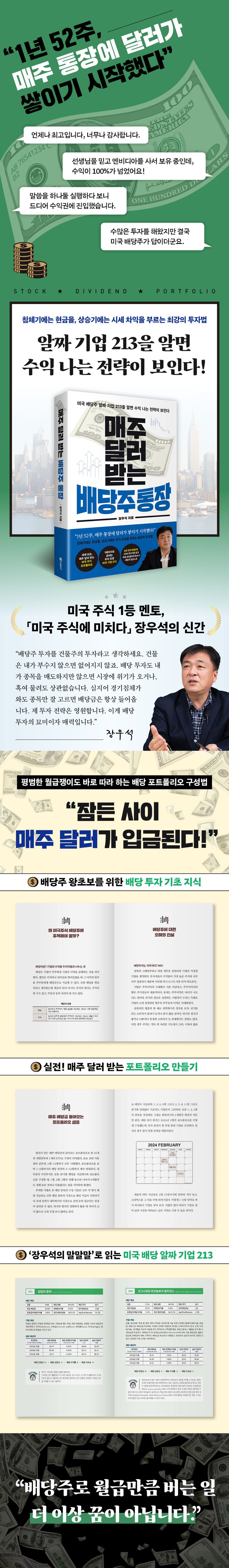 매주 통장에 돈이 쌓이는 것만큼 즐거운 상상도 없을 것이다. 미국 배당주에 투자한다면 누구나 그 상상을 현실로 만들 수 있다. 국내 주식과 달리 미국은 이익을 주주에게 환원하는 비율이 높고, 배당에 대한 인식이 높아 분기별로 배당을 지급하는 기업이 상당수다. 국내 주식과 달리 테마의 영향을 받지 않고, 꾸준하게 수익이 발생해 노후 자금 마련을 위해 안정적인 투자를 찾는 사람들이 최근 미국 배당주에 주목하고 있다. 이 책에서는 미국 배당주를 처음 접하는 투자자들을 위한 기초 상식은 물론, 매주 달러가 입금되는 포트폴리오를 만들기 위한 실전 전략을 제시한다. 그리고 수익 내는 알짜 배당 기업 213개를 장우석 저자의 생생한 코멘트와 함께 소개하여 성공적인 포트폴리오를 만들고, 이후 리밸런싱까지 전 과정을 돕는다. 미국 배당주를 처음 하거나, 하고는 있지만 효과적인 수익을 만들지 못하는 사람들 모두에게 도움이 되는 한 권의 책이다.