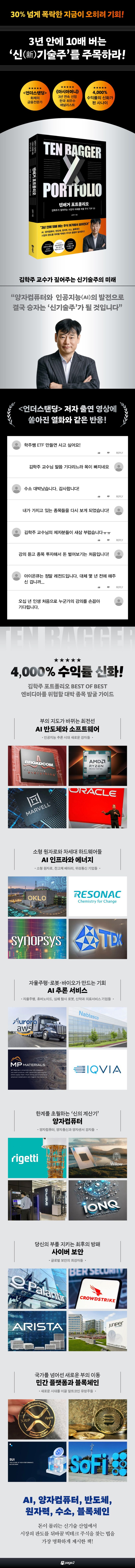 여의도 증권가에서 신기술 성장주 분석으로 명성이 높은 김학주 교수의 빅테크 기업 발굴 리포트이다. AI, 양자컴퓨터, 반도체, 원자력, 수소, 블록체인 등 주식 시장의 상승을 견인하는 신기술 산업의 성장과 변화를 분석하고 업계의 대장주 역할을 하는 기업들의 강점과 미래 전망을 담았다. 특히 이 책에서는 전후방으로 연결된 산업들이 긴밀하게 연계해서 서로 동반 성장을 꾀하는 신기술 성장주의 흐름을 눈에 보이도록 그려주고 있다. 이를테면 AI 산업이 활성화 되면서 반도체 산업이 발맞춰 변화하고 인공위성 산업도 함께 성장하는 모습을 보여주거나 전기 공급을 위해 소형 원자로 산업과 배터리 산업이 성장하는 모습을 보여준다. 지금 당장 오르는 종목만 찾던 독자에게 하나의 산업이 발달하면 그 다음 수혜주가 어디가 될지 그 흐름을 예측해서 오를 종목을 싸게 살 수 있도록 돕는 것이다. 더불어 지금 사두면 3년 안에 원금의 10배를 벌고, 10년 안에 엔비디아를 위협할 기업들을 각 장별로 소개하고 있다.