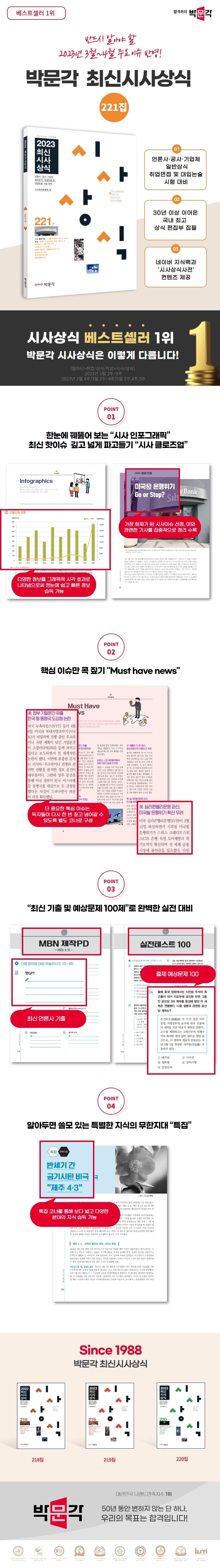 〈221집 최신시사상식〉은 공공기관.언론사.일반 기업체 입사를 앞둔 취업 준비생, 공무원 시험이나 대입 면접을 앞둔 수험생, 평소에 상식능력 함양에 관심을 가지고 있는 독자들을 위한 수험서 및 자기계발서입니다.