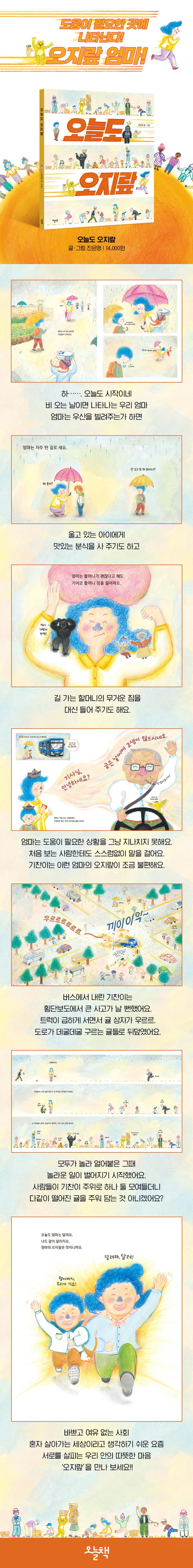 그런데 엄마의 오지랖이 사람들을 웃게 하고, 얼굴을 환하게 만들고, 기쁨을 주지 뭐예요. 기찬이는 오지랖에 묘한 매력이 있다는 걸 깨닫게 되지요. 기찬이 엄마의 따뜻한 오지랖 이야기 『오늘도 오지랖』에서 함께 만나 보아요.