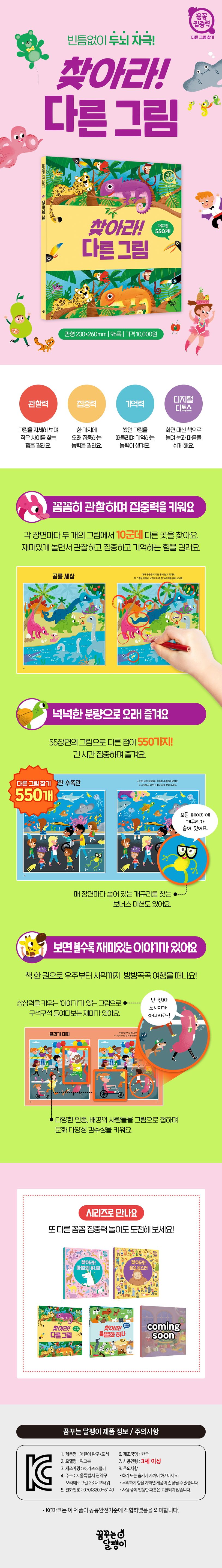 아이들의 상상력과 집중력을 길러줄 ‘꼼꼼 집중력’ 시리즈에는 다른 그림 찾기, 숨은그림찾기, 미로 찾기, 퍼즐 등 다양한 방식으로 생각하고 관찰하며 푸는 놀이가 가득해요. 집에서, 식당에서, 카페에서, 비행기 안에서! 언제 어디서든지 〈꼼꼼 집중력〉 시리즈와 함께 놀면서 생각하는 힘을 길러요!