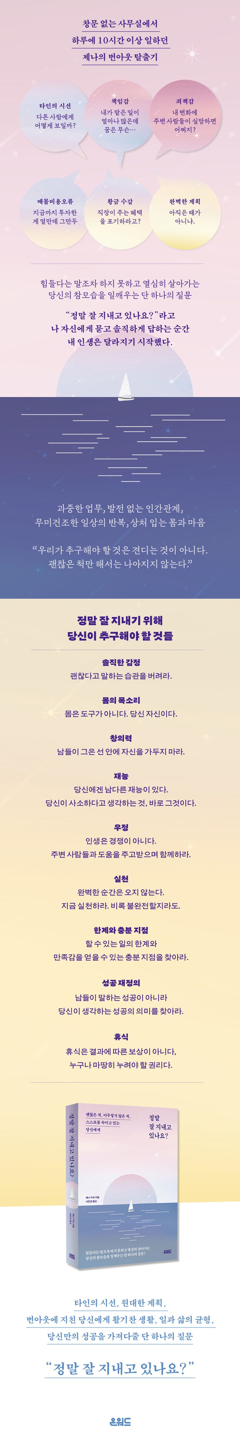 더 나은 미래를 갈망한다면 솔직하게 묻고 답해 보자. “정말 잘 지내고 있나요?” 이 질문은 당신의 참모습을 일깨우고 당신의 성공을 재정의할 단초가 될 것이다. 성공이란 타인의 인정이 아니라 자기 자신이 느끼는 것이다. 이 책은 경험을 통해 성공의 진정한 의미를 깨달은 저자의 솔직한 자기 고백이자 변화를 불러일으킬 동기를 만들어 줄 인생의 지침서다.