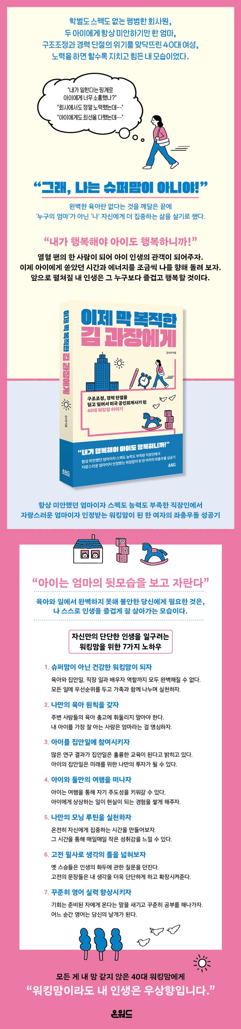 『이제 막 복직한 김 과장에게』에는 이처럼 완벽한 워킹맘이 되고 싶지만, 모든 게 내 맘 같지 않은 여성들에게 전하고 싶은 메시지를 담았다. 저자는 이 책이 “오늘 하루, 지금 이 순간을 아이들과 함께 즐기며, 동시에 자신만의 꿈을 찾아가는 워킹맘들에게 동기부여가 되면 좋겠다”라고 말한다. 이 책을 통해 일과 육아의 균형을 잡는 법을 함께 고민해보고, 더욱 단단한 자신을 일구는 실천적인 방법을 배워볼 수 있을 것이다.
