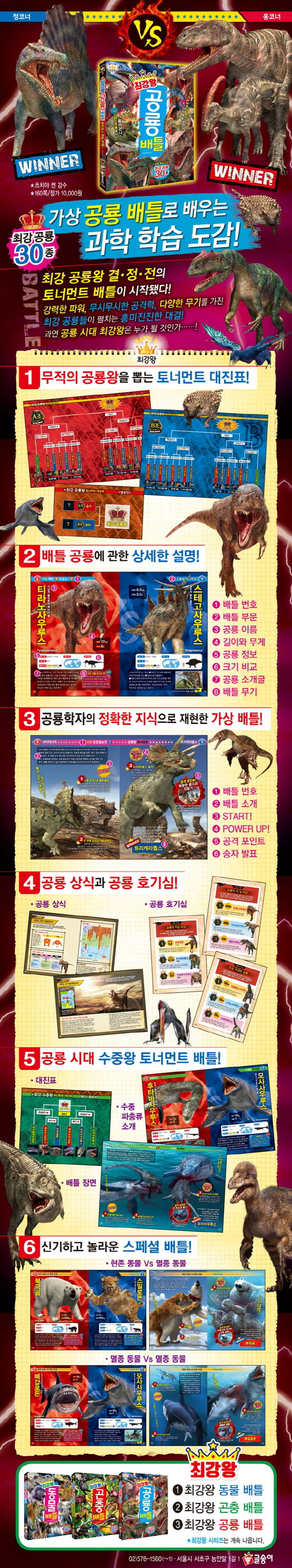 최강 공룡왕 결·정·전! 강력한 파워, 무시무시한 공격력, 다양한 무기를 가진 최강 공룡들의 흥미진진한 대결이 시작됩니다! 공룡들의 공격과 방어가 팽팽하게 맞서는 배틀 현장! 그 긴장감 넘치는 배틀 현장을 통해 공룡들의 공격과 방어 기술을 살펴보세요. 배틀에 출전하는 공룡들의 특징, 분류, 식성, 생존 시기, 화석 발견 장소 등의 정보도 배울 수 있어요. 왕좌를 두고 펼쳐지는 흥미진진한 배틀 현장으로 떠나 볼까요? 과연 최후의 승자는 누가 될까요?