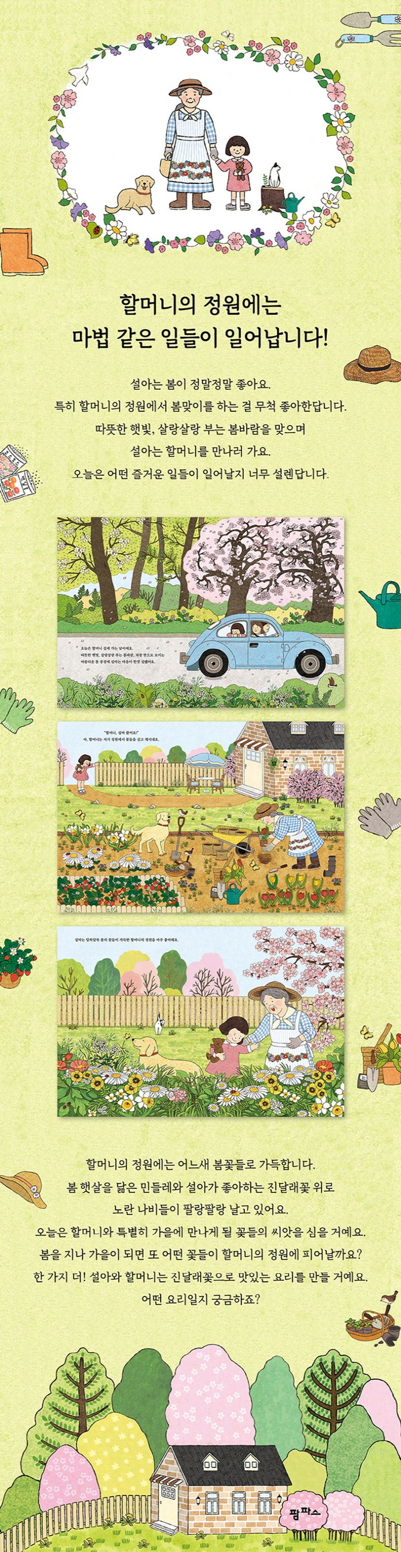 할머니의 정원에는 어느새 봄꽃들로 가득합니다. 봄 햇살을 닮은 민들레와 설아가 좋아하는 진달래꽃 위로 노란 나비들이 팔랑팔랑 날고 있어요. 오늘은 할머니와 특별히 가을에 만나게 될 꽃들의 씨앗을 심을 거예요. 봄을 지나 가을이 되면 또 어떤 꽃들이 할머니의 정원에 피어날까요? 한 가지 더! 설아와 할머니는 진달래꽃으로 맛있는 요리를 만들 거예요. 어떤 요리일지 궁금하죠?