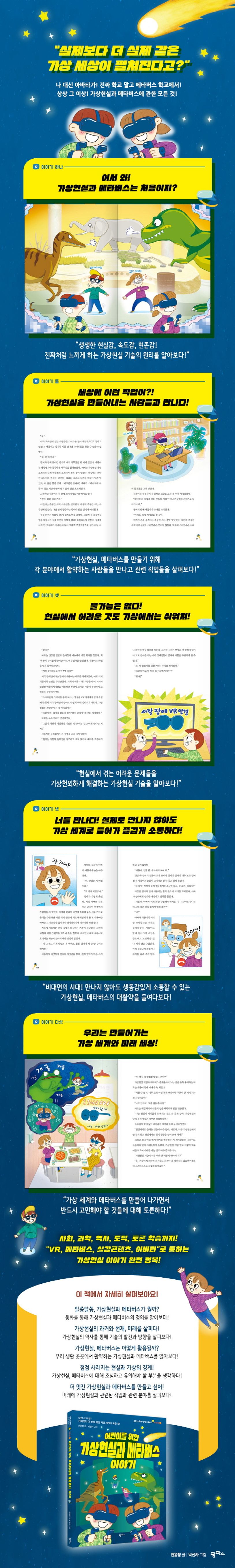 《어린이들을 위한 가상현실과 메타버스 이야기》는 우리 생활 깊숙이 스며든 가상현실 기술과 메타버스에 관해 흥미진진하게 알아본다. 동화를 통해 가상현실이란 것이 대체 무엇인지, 관련 기술에 대해 알아보고, 그 쓰임에 대해 살펴본다. 가상현실의 과거와 현재를 살펴보며 미래에 어떤 모습으로 활약하게 될지도 생각해 보게 한다. 또한 가상현실과 메타버스를 만들기 위해서는 어떤 직업이 있는지도 살펴보며 미래 사회의 한 축인 가상 세상에 대한 호기심과 흥미를 지핀다. 이 책을 통해 어린이 친구들은 가상현실, 메타버스에 대한 이해를 넓히고, 더 나아가 가상현실을 어떻게 발전시켜야 할지 생각해 보게 될 것이다. 더 나아가 가상과 실제의 경계가 흐려지면서 나타나는 고민과 문제에 대해 생각해볼 거리를 던져준다. 가상현실과 메타버스와 함께 행복하고 안전한 미래를 만들기 위해 어린이 친구들이 반드시 봐야 할 미래 과학 동화책이다.