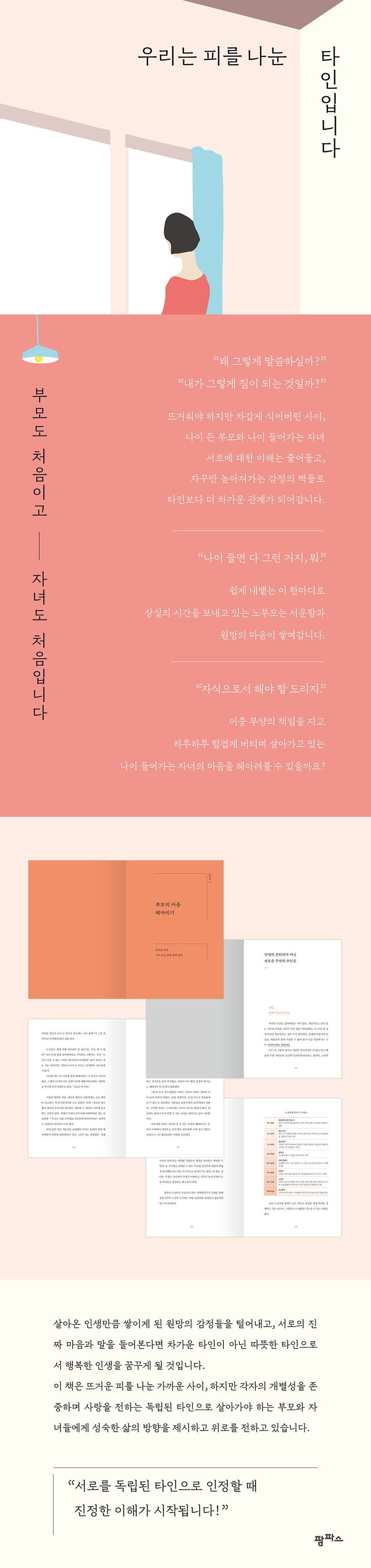 소외된 사람들에게 치유와 긍정, 지지와 격려의 힘을 전하기 위해 심리상담을 진행하고 있는 저자는 그동안의 사례들을 모아 진정한 가족의 관계에 대한 이야기를 전하고 있습니다. 인생의 은퇴자가 되어 힘겨운 시간을 보내고 있는 부모의 심리, 가족 부양이라는 책임감으로 지쳐 있는 자녀의 심리를 실제 사례를 통해 객관적인 눈으로 바라보며 서로를 이해하는 마음을 갖게 합니다. 그리고 더 이상 일방적인 사랑을 원하거나 고통을 주는 존재가 되지 않기 위한 심리적 안전거리를 유지할 수 있는 방법을 보여줍니다. 그리고 이를 통해 다시 한번 진정한 가족으로 거듭날 수 있도록 좋은 관계란 무엇인지를 생각해볼 수 있습니다.
