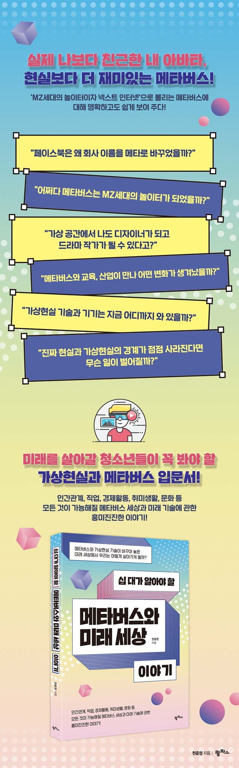 《십 대가 알아야 할 메타버스와 미래 세상 이야기》는 현실과 가상의 경계가 사라지는 미래 세상에 대해 이야기하며 현실을 확장시키는 가상 세계인 ‘메타버스’에 대해 흥미진진하게 알아보는 책이다. 메타버스의 기반이 되는 가상현실 기술이 어떻게 발전해왔는지부터 다양한 영역에서 활용되는 가상현실과 메타버스의 현재와 메타버스가 나아갈 방향까지 차근차근 살펴본다. 이를 통해 메타버스가 어느 날 갑자기 등장한 세계가 아니라 기술의 발전과 함께 우리 앞에 자연스럽게 도래했음을 이해하게 된다. 또한 미래의 주인공 십 대 청소년들이 메타버스 세상을 어떻게 즐기고 활용할 수 있는지 알려 준다. 제페토, 로블록스와 같이 현재 인기 있는 메타버스 플랫폼은 물론 교육, 산업, 경제 전반에서 활약하는 메타버스 서비스와 직종에 대해서도 소개한다. 블록체인, NFT와 같은 신 기술이 메타버스에서 어떻게 만나서 쓰이는지도 들여다본다. 기회의 땅으로 알려진 메타버스를 슬기롭게 꾸려 나가기 위해 청소년들이 무엇을 고민하고 또 준비해야 하는지도 이야기한다.