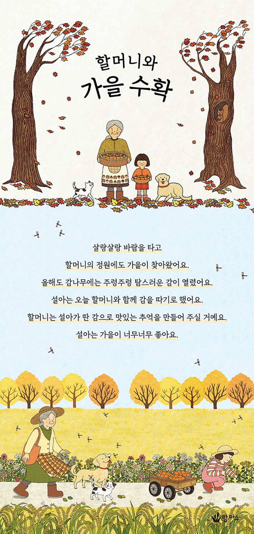 할머니의 정원에도 가을이 찾아왔어요. 오늘 설아는 할머니의 정원 가득 열린 감을 따러 가요. 해마다 달콤한 감을 선물해 주는 고마운 감나무예요. 재미있게 딴 감을 수레에 싣고 할머니와 설아는 이웃들에게 감을 나눠주기로 했어요. 과수원집 한 바구니, 밤나무집 할아버지에게 한 바구니. 꽃집 아주머니에게 한 바구니. 설아는 이웃들에게 아주 고마운 선물도 받았어요. 어떤 선물이었을까요?