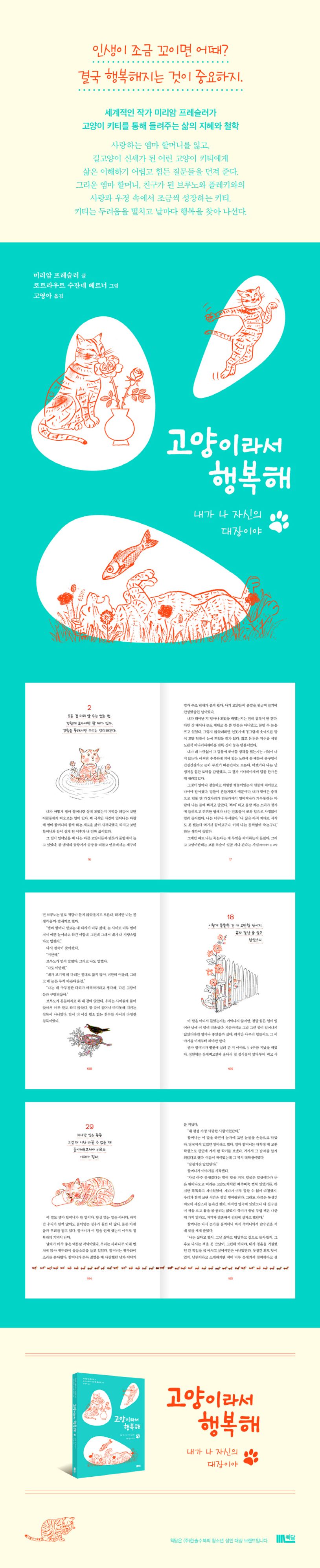 인생이 조금 꼬이면 어때? 결국 행복해지는 것이 중요하지. 고양이 키티를 주인공으로 한 멋진 성장소설 『고양이라서 행복해』. 사랑하는 엠마 할머니를 잃고, 길고양이 신세가 된 어린 고양이 키티에게 삶은 이해하기 어렵고 힘든 질문들을 던져 준다. 그리운 엠마 할머니, 친구가 된 브루노와 플레키와의 사랑과 우정속에서 조금씩 성장하는 키티. 키티는 두려움을 떨치고 날마다 행복을 찾아 나선다.