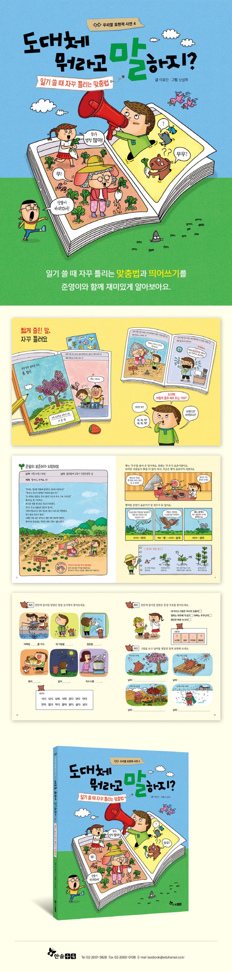 맞춤법은 생각이나 뜻이 서로 잘 통하게 하기 위해 만든 규칙이고 약속이에요. 글과 말로 자기 생각을 효과적으로 표현하려면 맞춤법 공부는 기본이고 필수입니다. 《도대체 뭐라고 말하지? 일기 쓸 때 자꾸 틀리는 맞춤법》은 우리말 표현력 사전 시리즈 4권으로, 아이들이 일기를 쓸 때 자주 틀리는 맞춤법과 띄어쓰기를 재미있는 에피소드를 담은 일기와 만화식 설명으로 쉽게 알려 줍니다. 또한 날씨에 대한 다양한 우리말 어휘를 알려 주고, 생생하고 풍부하게 날씨를 표현할 수 있게 도와줍니다. 책의 마지막에는 우리말 퀴즈와 더 알아 두면 좋은 맞춤법 상식을 추가로 구성하여, 배운 내용을 되새겨 보고 국어 기초 능력을 탄탄하게 다질 수 있게 했습니다.