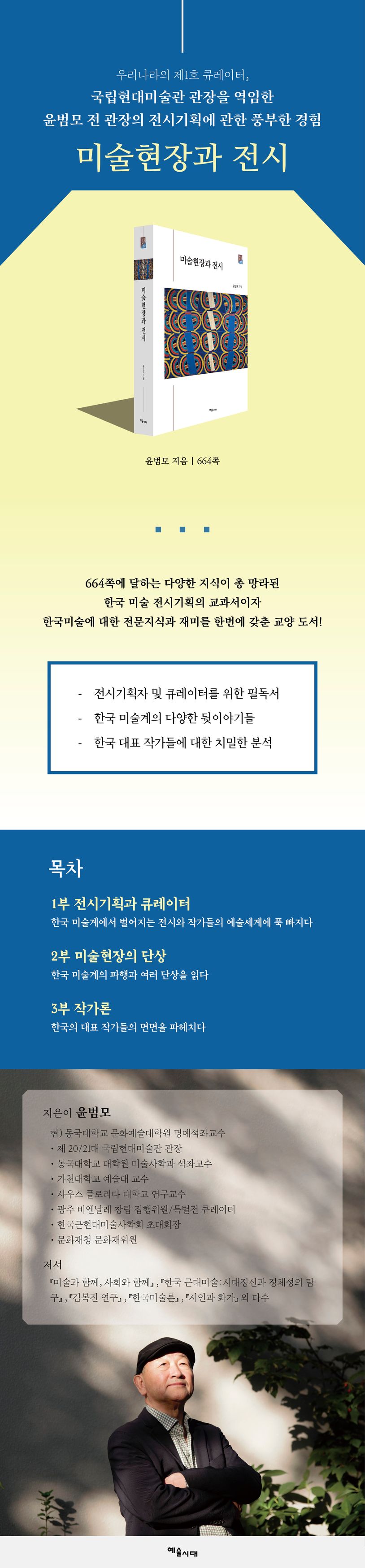 제1부는 윤범모 전 관장이 전시기획자로서 기획한 전시들에 대한 설명이다. 주로 도록이나 자료집 등에 실렸던 기고문들이 정리되고 있다. 우리는 1부를 통해 2000년대 한국 내에서 이루어진 굵직굵직한 전시의 흐름을 읽을 수 있다. 제2부는 저자가 제목 그대로 미술 현장에서 느낀 단상을 수필처럼 써내려가고 있는데, 미술계의 현실을 날카롭게 통찰하는 글 중에 매우 씁쓸하면서도 유머러스한 필치가 그가 시인임을 보여주고 있다. 미술품의 진위 문제, 즉 위조 문제를 다루는 파트는 매우 흥미롭다. 3부는 한국 미술계의 대표 작가들을 분석하고 있는 작가론이다. 평론가로서 한국 작가들에 대한 매우 심도있는 분석은 풍성한 한국 미술계를 돌아보게 한다.
