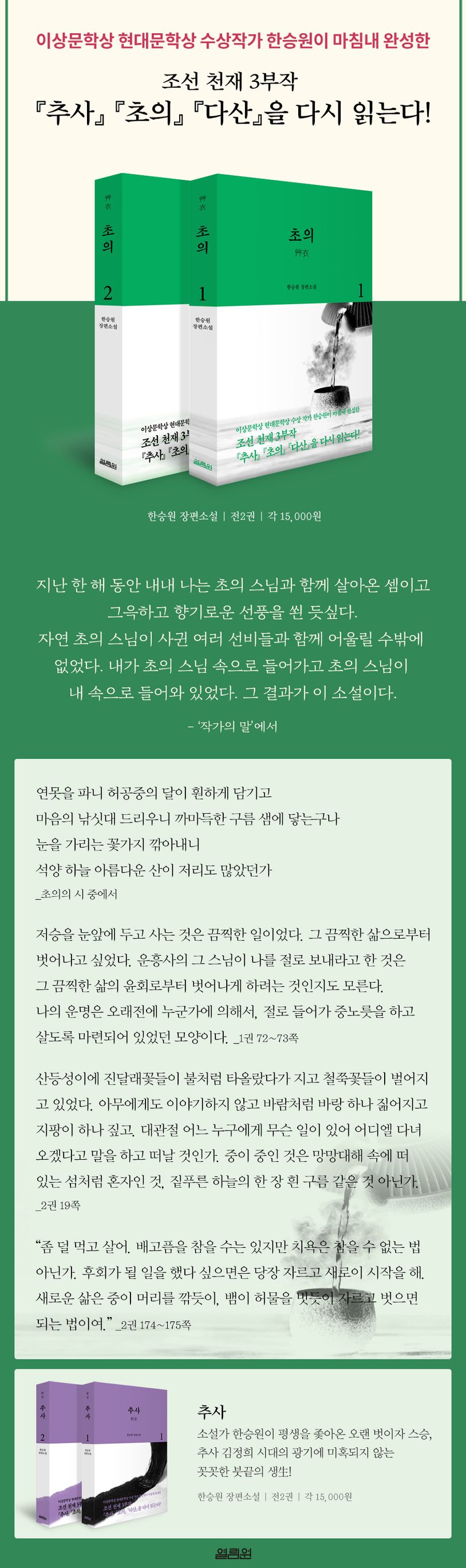 “한국 차의 중시조”라 불리는 차의 선승, 초의(草衣). 그 이름대로 평생을 “풀옷의 소탈한 정신”으로 살아온 그는 조선 후기 다산 정약용, 추사 김정희와 함께 실학을 바탕으로 “묵은 세상”을 바꾸려 했던 인물이다. 한승원 소설가는 이 소설에 한 인간으로서의 ‘초의’의 모습을 생생하게 담아냈다. 매 순간 백성 구제를 고민하는 ‘스님’ 초의뿐만 아니라 가장 가까운 벗들과 마음을 나누는 ‘청년’ 초의까지, 이 소설을 통해 베일에 가려 있던 그의 삶을 재탄생시켰다. 책의 마지막에는 “사실과 허구 사이의 간극을 조율”하기 위해 「초의 스님의 행장」을 함께 실었다.