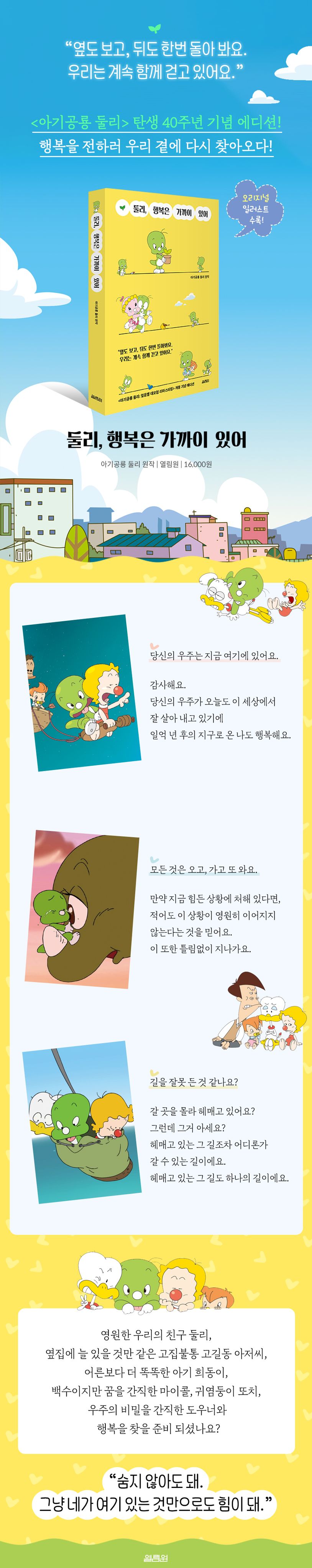 둘리 에세이가 〈아기공룡 둘리〉 탄생 40주년을 맞아 새로운 표지로 다시 출간되었다. 1983년 서울 쌍문동에 나타난, 머나먼 우주에서 온 둘리! 40년의 세월 동안 우리 곁을 지켜 온 둘리는 세대를 뛰어넘어 모두가 사랑하는 친구다. 오랫동안 만화와 TV 애니메이션, 영화로 사랑받아 온, 그리고 이제는 그 누구도 대체할 수 없는 추억의 아이콘이 된 둘리를 책으로 만난다. 영화 〈아기공룡 둘리: 얼음별 대모험 리마스터링〉 개봉을 기념하여 새 옷을 입은 에세이 『둘리, 행복은 가까이 있어』는 풀 컬러 오리지널 일러스트레이션과 행복을 전하는 둘리의 따뜻한 말로 꽉 차 있다. 일상에 지치고 갈 곳을 잃은 현대인들에게 둘리는 타인과 비교하지 않는 법, 온전히 나 자신을 사랑하는 법, 자신이 진정 원하는 것을 찾는 법을 알려 줄 것이다.
