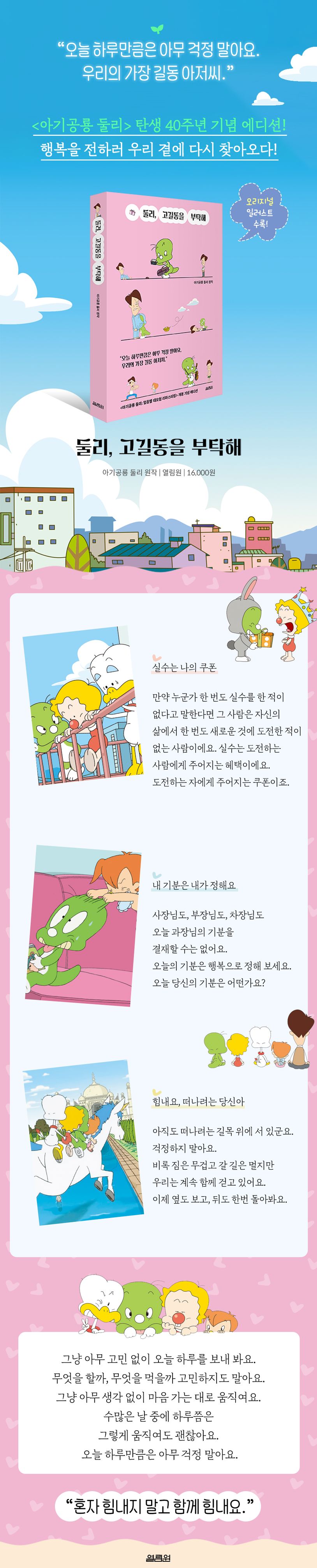 둘리 에세이가 〈아기공룡 둘리〉 탄생 40주년을 맞아 새로운 표지로 다시 출간되었다. 1983년 서울 쌍문동에 나타난, 머나먼 우주에서 온 둘리! 40년의 세월 동안 우리 곁을 지켜 온 둘리는 세대를 뛰어넘어 모두가 사랑하는 친구다. 오랫동안 만화와 TV 애니메이션, 영화로 사랑받아 온, 그리고 이제는 그 누구도 대체할 수 없는 추억의 아이콘이 된 둘리를 책으로 만난다. 영화 〈아기공룡 둘리: 얼음별 대모험 리마스터링〉 개봉을 기념하여 새 옷을 입은 에세이 『둘리, 고길동을 부탁해』는 풀 컬러 오리지널 일러스트레이션과 위로를 전하는 둘리와 고길동의 따뜻한 이야기로 꽉 차 있다. 회사와 집을 오가는, 때로는 도망치고 싶은 일상에 지쳤다면 『둘리, 고길동을 부탁해』를 통해 고단한 마음을 달래보자. 삶이 고달픈 이 시대의 고길동들에게, 둘리가 조금 더 나은 삶의 방향으로 갈 수 있는 작은 지혜를 전해 줄 것이다.