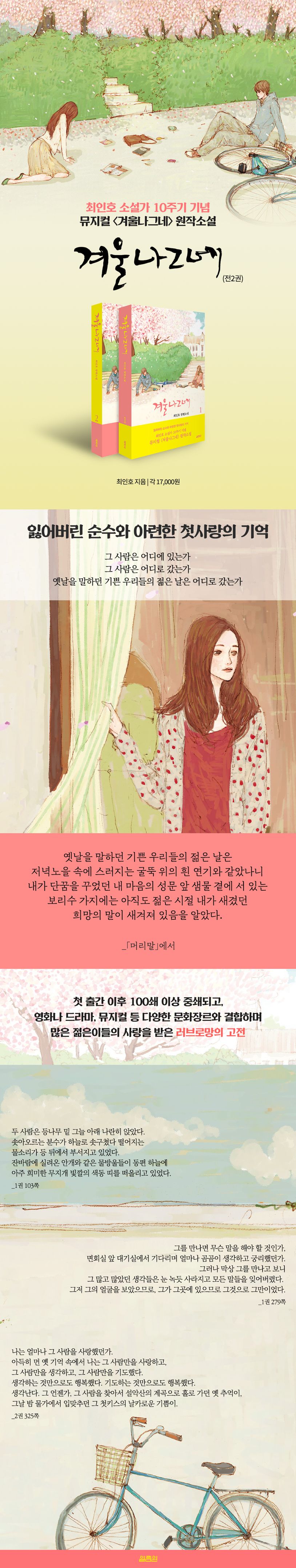 청년문화의아이콘이자한국현대문학의거장,최인호소설가의『겨울나그네』개정판이출간되었다.이소설은1984년동아일보에일년여를연재하였던것으로,같은해첫출간이후100쇄이상중쇄될정도로많은젊은이들에게사랑을받아왔다.젊은날누구나한번쯤꿈꾸어봤을아름답고비극적인사랑과젊은날의방황,고통의시간이녹아있기때문일것이다.