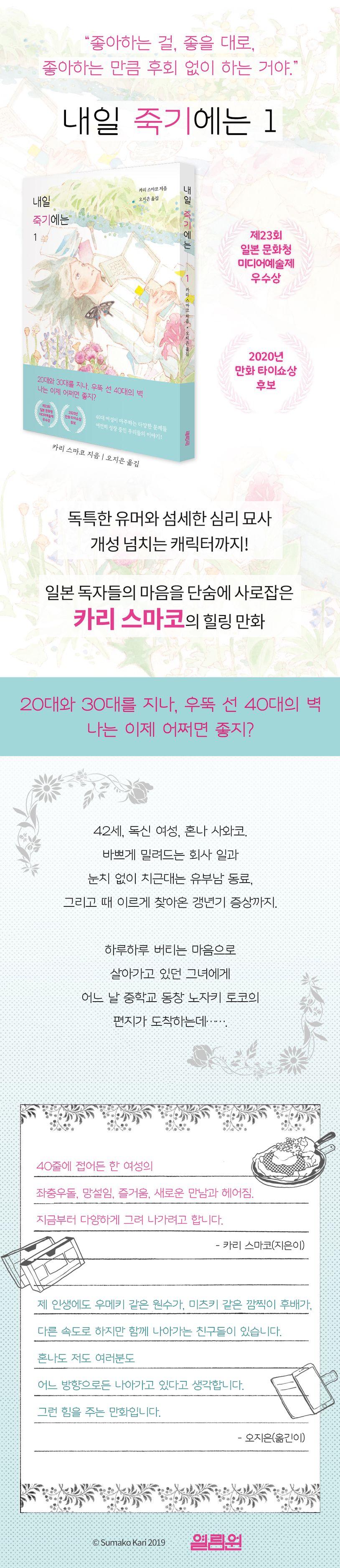 어른이 되면 모든 것이 다 수월하고 쉬울 줄로만 알았는데, 우뚝 선 40대의 벽이 그저 혼란스럽기만 한데……. 40대 여성이 마주하는 다양한 문제들을 카리 스마코의 섬세하고 유머러스한 시선으로 포착한 『내일 죽기에는』은 여전히 성장 중인 우리들의 등을 다정하게 토닥여 준다!