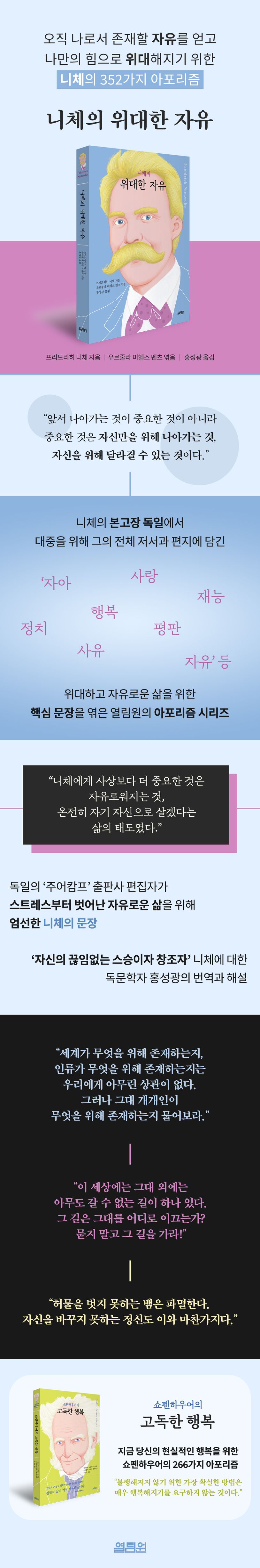 『니체의 위대한 자유』는 니체의 본고장 독일에서 직접 대중을 위해 기획하고 엮은 열림원의 아포리즘 시리즈 두 번째 책이다. 이 책의 편저자 우르줄라 미헬스 벤츠는 브레히트, 아도르노, 벤야민 등 세계적인 지성들의 책을 소개해온 독일의 유명 출판사 ‘주어캄프’ 편집자 출신으로, 니체의 전체 사상을 간추려 8장으로 묶고 저작에서 352문장을 엄선했다. ‘자아-행복-사랑-재능-정치-사유-평판-자유’로 각 장을 포괄하는 8개의 키워드는 삶에서 떨어트릴 수 없는 뼈대와 같은 요소로, 니체는 위와 관련한 문장들을 관통해 자신으로부터 끊임없이 탈피하고 새로워짐으로써 자유롭고 위대한 ‘나’가 되어야 한다고 제안한다. 번역은 『차라투스트라는 이렇게 말했다』 『도덕의 계보학』 『비극의 탄생』 등을 포함한 다수의 니체 원전과 독일 철학서를 번역한 홍성광이 맡았다. 니체의 저작에서 핵심만을 추출한 짧고 굵은 아포리즘에 뒤이어 홍성광의 구체적이고도 심도 있는 해설은 ‘위대함’과 ‘자유로움’에 대한 니체의 독창적인 사유를 더욱 풍부하게 읽을 수 있도록 돕는다.