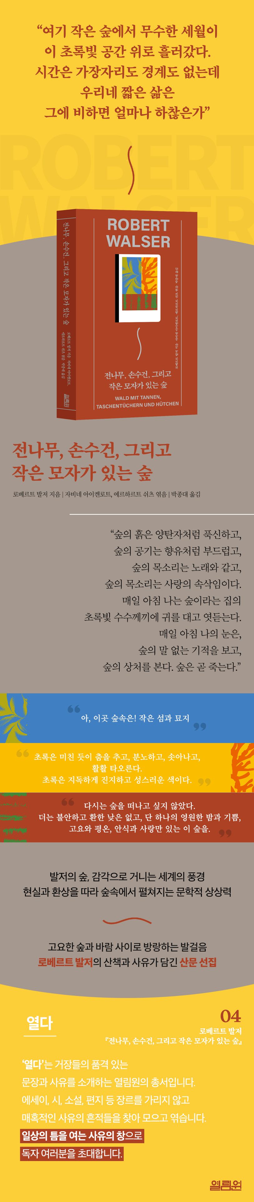스위스 문학의 대표적인 작가 로베르트 발저의 산문, 시, 단편 중 ‘숲’을 테마로 삼은 텍스트를 중심으로 새롭게 엮은 선집 『전나무, 손수건, 그리고 작은 모자가 있는 숲』이 열림원 총서 ‘열다’의 네 번째 책으로 출간되었다. 발저는 숲에서 마주한 여러 요소를 통해 일상적이면서도 생생한 삶의 감각을 되살린다. 그는 자연을 멀찍이 떨어져 관찰하거나 설명하는 대신 그것을 직접 듣고 만지며, 느끼고 비유하고 사랑한다. 발저에게 숲은 은유의 장이자 선명한 감각이 열리는 세계다. “숲의 흙은 양탄자”가 되고, “숲의 목소리는 사랑의 속삭임”이 되며, 우리는 발저가 만든 숲의 공기를 “향유처럼” 들이마신다. 발저가 깊은 숲속으로 파고 들어가 엮어낸 비유들은 자연과 인간 사이의 교감, 그 틈새에서 태어난 탁월한 문학적 상상력이다. 그는 사랑이라는 감정의 본질을 숲이라는 풍경 안에 투영한다. 『전나무, 손수건~』 속 소년은 말한다. “나는 숲속 깊숙이 들어가고 싶고, 숲을 갖고 싶고, 숲이 있는 그대로의 나를 가졌으면 좋겠는데. (…) 숲은 왜 나를 오게 해놓고 다시 쫓아내는 걸까요?” 여기에는 숲을 향한 한 아이의 맹목적이고도 순정한 사랑이 고스란히 담겨 있다. 그는 숲을 두려워하면서도 갈망하고, 거부당하면서도 다시 찾아간다. 이 어린 소년의 울음은, 숲을 통해 사랑이란 결국 닿을 수 없음에도 끝내 포기하지 않는 마음이라는 걸 보여준다. 그리고 발저는 그 숲의 한가운데에서, 마치 동화의 한 장면처럼 조용히 남겨진 흔적과 마주친다. “전나무 가지와 작은 손수건, 그리고 작은 인형 모자” 그것들은 아이가 숲에 남기고 간 작고도 사랑스러운 마법의 징표이다. 발저는 이 작은 물건들에서 어떤 설명이나 해석보다 더 크고 섬세한 감정을 발견한다. 그가 숲을 바라보는 시선은 때로 철학자의 것이지만, 그걸 옮겨 쓰는 손은 언제나 시인의 것이다. 자연이 어떻게 인간의 내면과 맞닿아 있는지, 숲과 인간 사이에서 문학이 어떤 숨결을 얻는지 발저는 숲의 가장 내밀한 곳으로 우리를 초대한다.