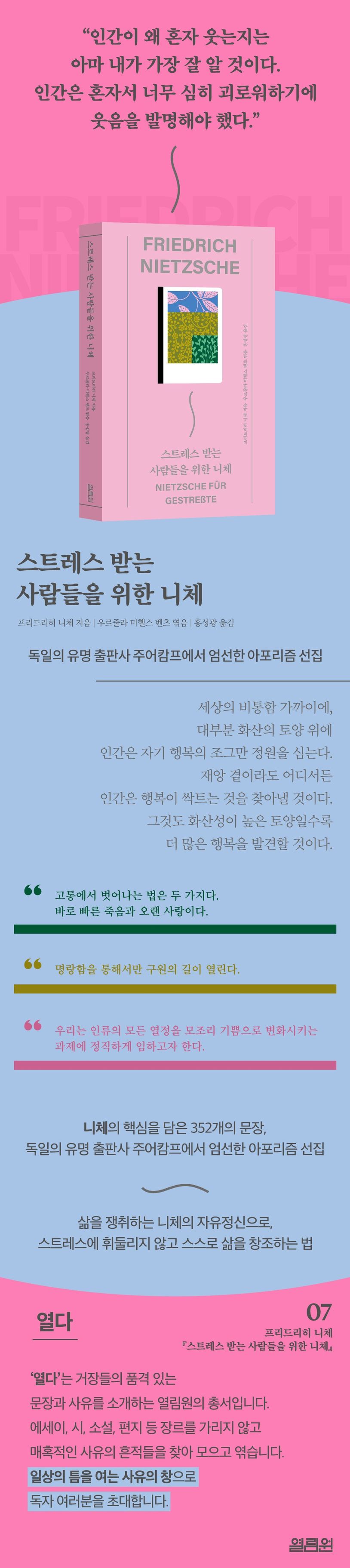 『스트레스 받는 사람들을 위한 니체』는 니체의 본고장 독일에서 직접 대중을 위해 기획하고 엮은 열림원의 아포리즘 선집이다. 이 책의 편저자 우르줄라 미헬스 벤츠는 브레히트, 아도르노, 벤야민 등 세계적인 지성들의 책을 소개해온 독일의 유명 출판사 ‘주어캄프’ 편집자 출신으로, 니체의 전체 사상을 간추려 8장으로 묶고 저작에서 352문장을 엄선했다. ‘자아-행복-사랑-재능-정치-사유-평판-자유’로 각 장을 포괄하는 8개의 키워드는 삶에서 떨어트릴 수 없는 뼈대와 같은 요소로, 니체는 위와 관련한 문장들을 관통해 스스로를 단단히 세우고 스트레스로부터 벗어나는 방향을 제시한다. 번역은 『차라투스트라는 이렇게 말했다』 『도덕의 계보학』 『비극의 탄생』 등을 포함한 다수의 니체 원전과 독일 철학서를 번역한 홍성광이 맡았다. 니체의 저작에서 핵심만을 추출한 짧고 굵은 아포리즘에 뒤이어 홍성광의 구체적이고도 심도 있는 해설은 니체의 독창적인 사유를 더욱 풍부하게 읽을 수 있도록 돕는다.