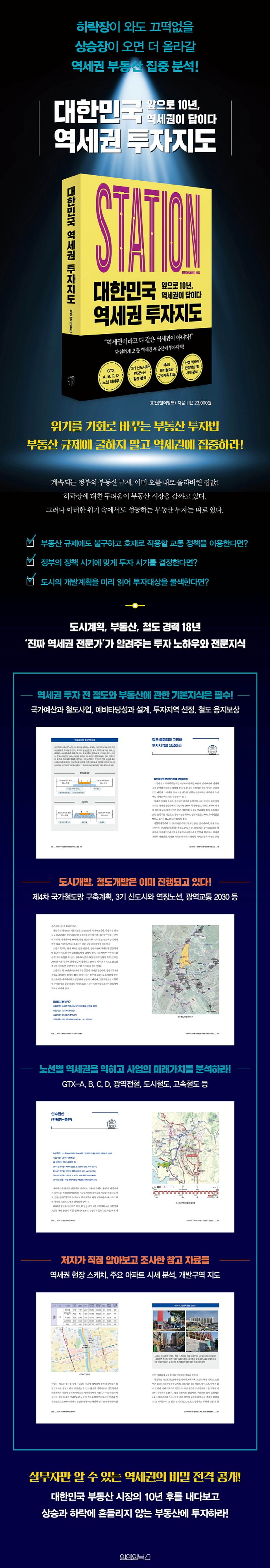 이 책은 역세권의 모든 것을 다룬다. 가치가 오를 만한 투자지역을 이야기해주는 것에서 그치지 않고, 더 나아가 독자가 투자대상을 판별하는 눈을 기를 수 있도록 확실한 정보와 이론을 전달하는 데 목적을 두었다. GTX-A, B, C, D 노선과 3기 신도시, 제4차 국가철도망 구축계획과 광역교통 2030, 철도역 신설 예정지와 기존 역세권의 시세 분석, 철도 예산, 철도사업별 방식과 기간, 노선별 투자가치, 수도권뿐만 아니라 전국에 걸친 역세권까지 총망라했다. 특히 저자가 직접 발품을 팔며 정리한 현장 모습은 그 지역의 분위기를 생생하게 보여주며, 현재 각광받는 지역뿐만 아니라 앞으로 10년 안에 호재가 찾아올 지역까지 파악한다.