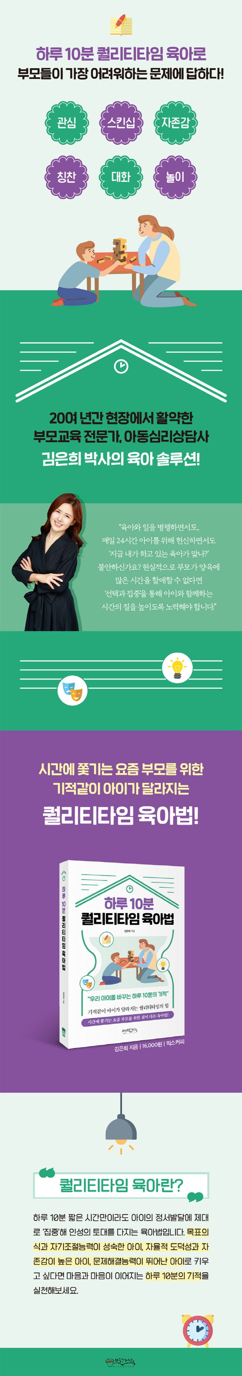 『하루 10분 퀄리티타임 육아법』은 육아와 일을 병행하면서도 늘 죄책감을 가지고 있는 부모들을 위한 책이다. 매일 24시간 아이를 위해 헌신하지만 ‘지금 내가 하고 있는 육아가 맞나?’ 불안한 부모들을 위해 질 좋은 육아에 대한 방향을 안내한다. 현실적으로 부모가 양육에 많은 시간을 할애할 수 없다면 ‘선택과 집중’을 통해 아이와 함께하는 시간의 질을 높이도록 노력해야 한다. 하루 10분이라도 아이의 마음, 즉 ‘정서’에 제대로 집중한다면 긍정적인 ‘부모-자녀’ 관계를 형성하고, 아이의 바른 인성과 자존감을 키울 수 있다.