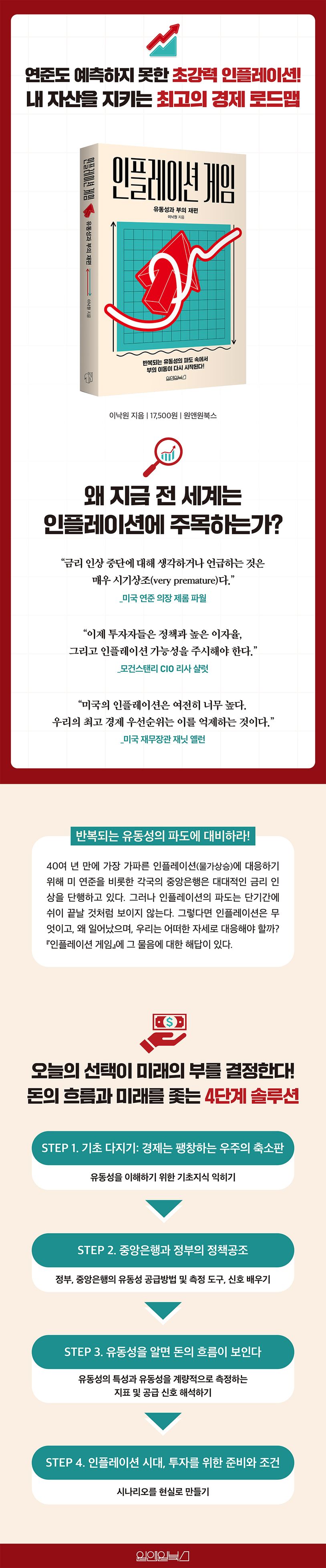 코로나19 팬데믹과 러시아-우크라이나 전쟁의 여파로 전 세계를 덮친 인플레이션. 40여 년 만에 가장 가파른 인플레이션(물가상승)에 대응하기 위해 미 연준을 비롯한 각국의 중앙은행은 대대적인 금리 인상을 단행하고 있다. 그러나 인플레이션의 파도는 단기간에 쉬이 끝날 것처럼 보이지 않는다. 그렇다면 인플레이션은 무엇이고, 왜 일어났으며, 우리는 어떠한 자세로 대응해야 할까? 『인플레이션 게임』에 그 물음에 대한 해답이 있다.