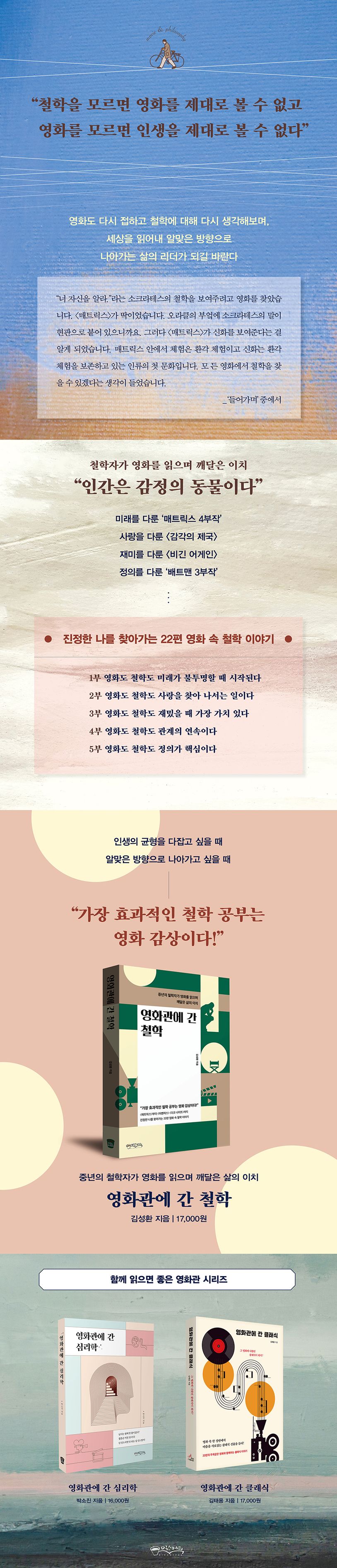 이 책은 철학이라는 창으로 영화를 들여다보며 궁극적으로 인생과 세상을 제대로 읽어내고자 하는 목적을 지녔다. 철학이 영화를 지나 인생과 세상에 다다르는 와중에 진정한 나를 찾을 수 있을 거라 기대해 마지않는다. 한편 가장 효과적인 철학 공부가 다름 아닌 영화 감상이기도 하다.