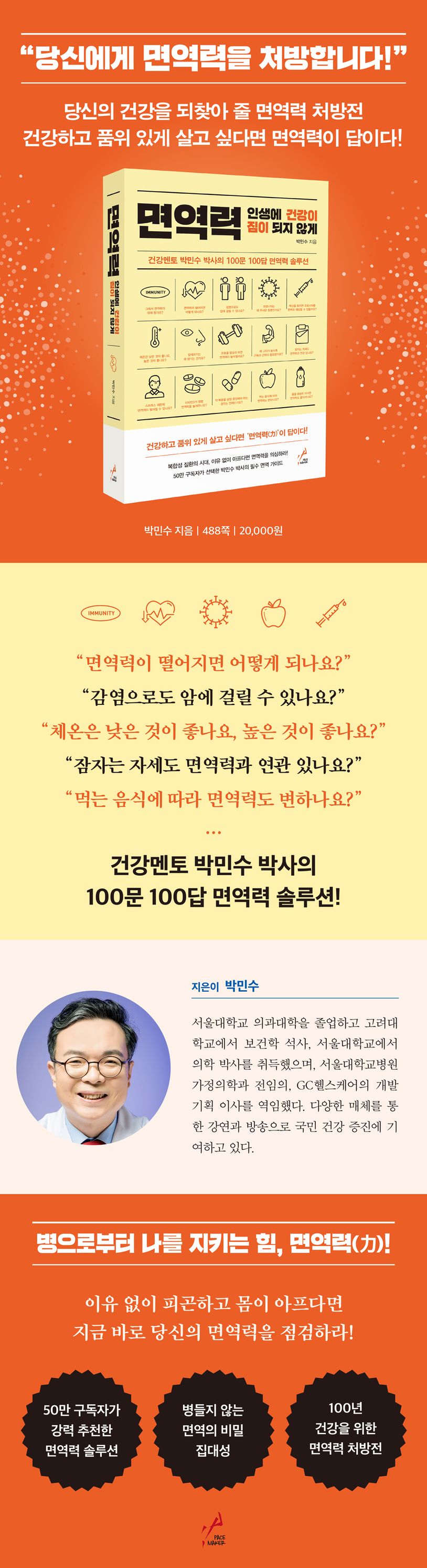 이 책 『면역력: 인생에 건강이 짐이 되지 않게』는 건강 분야 베스트셀러 저자이자, 오랜 세월 대중에게 건강을 알리는 건강 전도사로 지낸 박민수 박사가 쓴 면역에 관한 모든 것이다. 그동안의 경험과 연구, 유튜브 운영을 통해 정리한 면역력 정보들 가운데 핵심만 추려 100문 100답 형식으로 총망라했다.