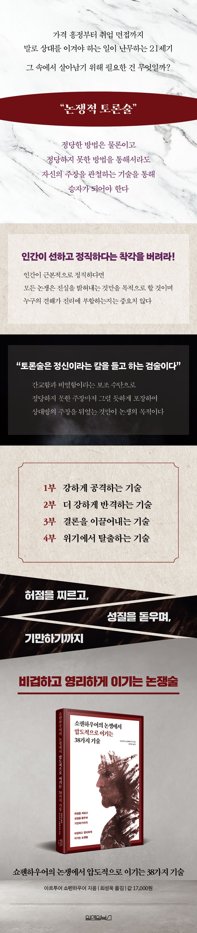 이 책은 수단과 방법을 가리지 않고 논쟁에서 승리하는 기술을 담았다. 하지만 오로지 그것만을 강조한 책은 결코 아니다. 쇼펜하우어는 당신이 논쟁에서 쏟아져 나오는 간계의 실체를 속속들이 들춰냄으로써 상대방의 기만책을 감지하고, 물리치기를 소원했다. ‘객관적 진리를 탐구한다’는 토론의 본래 목적을 준수할 수 없다면 차라리 자신의 주장이 얼마나 정당한지 입증하라. 그리고 그 과정에서 쇼펜하우어가 진실로 말하고자 했던 바를 깨우치길 바란다.
