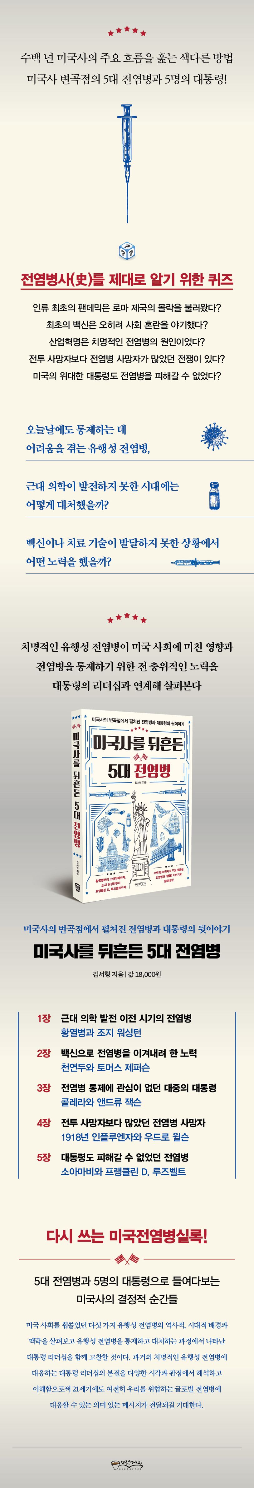 이 책 『미국사를 뒤흔든 5대 전염병』은 미국 사회를 휩쓸었던 다섯 가지 전염병의 역사적, 시대적 배경과 맥락을 살펴보고 다섯 명의 대통령이 어떻게 전염병을 통제하고 대처했는지 들여다봤다. 특별한 역사와 소소한 일상의 시간이 만나는 지점의 다양한 이야기를 전하는 ‘역사가 우리를 강하게 만든다’ 시리즈 여덟 번째 책이다.