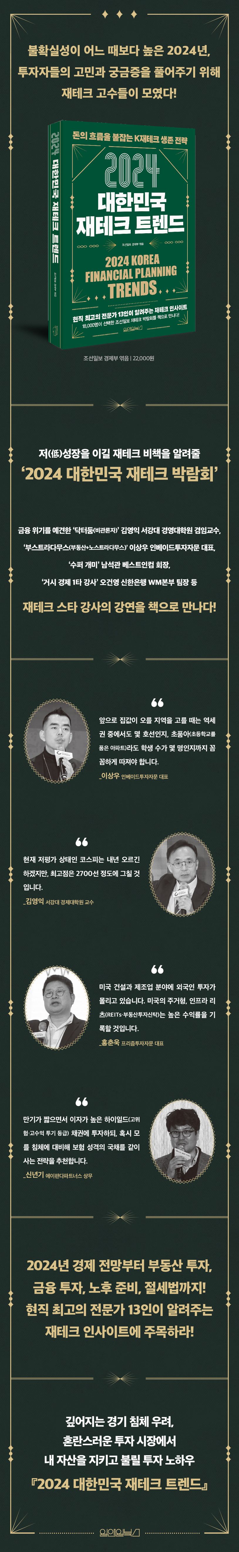 이 책은 2014년 이후 매년 조선일보에서 주최하고 있는 ‘2024 대한민국 재테크 박람회’에서 강연한 내용을 다듬고 보강해 엮은 책이다. 시장 전망, 금융 및 부동산 투자 전망, 노후 전략에 대해 현직 최고의 투자 전문가 13명의 메시지를 담았다.