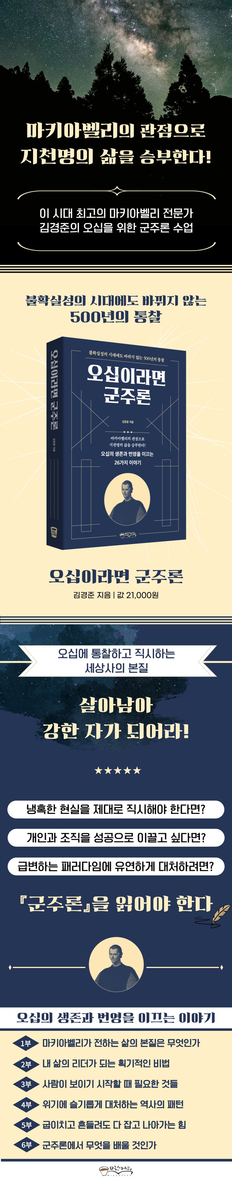 오십에는 조직에서 리더의 역할을 경험하고 젊은 시절 품었던 이상과 사회생활에서 실제로 맞닥뜨린 현실의 간극을 실감한 나이다. 나아가 공자가 지천명이라고 했듯 세상을 보는 나름의 관점이 정립되는 나이다. 고귀한 이상을 추구하려면 냉혹한 현실을 다룰 줄 알아야 한다는 마키아벨리의 통찰이 오십의 생존과 번영을 위한 보편적 진리를 증언하고 있다.