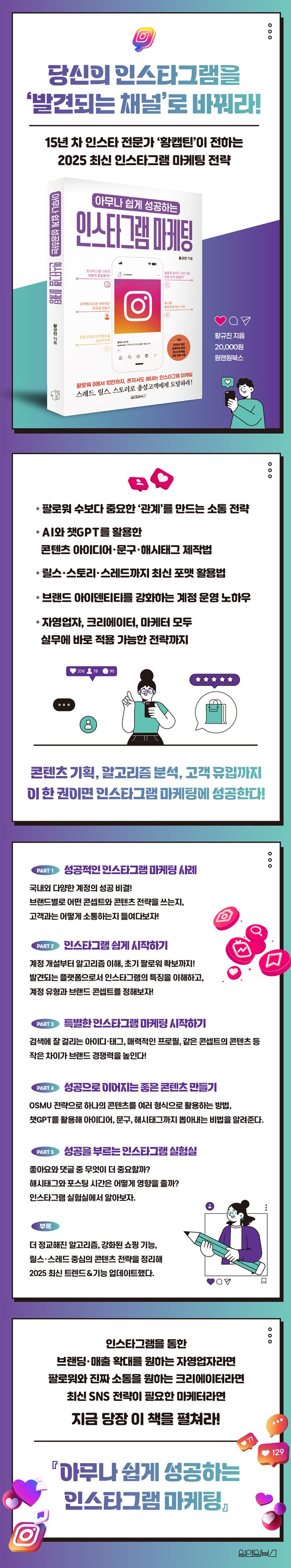 최신 인스타그램 알고리즘과 릴스, 스토리, 스레드 등 기능별 전략을 알고 싶다면 이 책에 주목하자. 이 책에서는 계정 개설부터 콘텐츠 제작, 팔로워 소통, 알고리즘 분석, 고객 유입 전략까지 인스타그램을 ‘실제 비즈니스 도구’로 활용하기 위한 노하우를 담았다. 따라 하기 쉬운 구성과 실제 사례 중심의 설명으로 마케팅 도구로 인스타그램을 최적화하는 방법을 알려준다. 인스타그램을 처음 시작하는 사람부터 더 나은 결과를 원하는 소상공인, 자영업자, 브랜드 마케터까지, 이 책에서 다루는 내용만 터득해도 효과적으로 인스타그램을 운영해나갈 수 있을 것이다.
