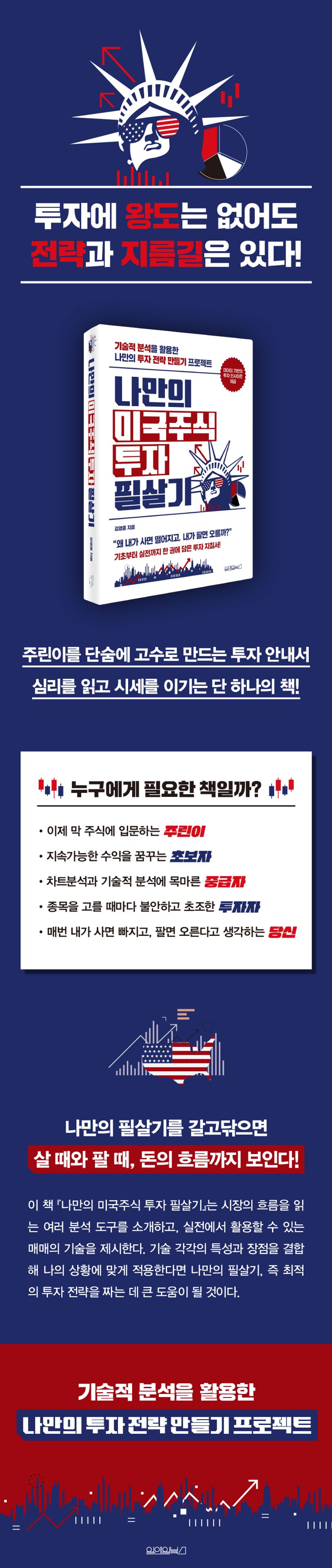 나만의필살기를갈고닦으면살때와팔때,돈의흐름까지보인다!이책의목표는단순히부자가되는것이아니다.지속가능한투자법으로경제적자유와풍부한현금흐름을동시에확보하는것이다.1장‘미국주식투자의시작’에서는미국주식투자의당위성과초보자가꼭알아야할주식투자의도구들,경제지표에대해소개한다.2장‘주가차트를내손안에’에서는과거와현재,그리고미래예측을반영한주가흐름을포착하는주가차트분석노하우를다룬다.3장‘실전매매기술’에서는실전에바로적용가능한피라미드매매법,싱글신호매매법,터닝포인트갭대응법,조정등급별대응법,추세바닥대응법,헤드앤숄더패턴에대해배운다.4장‘나만의투자전략필살기’에서는앞서배운분석도구활용법과매매기술을바탕으로MA6전략,롬버스전략,MT전략,원웨이전략등투자전략을세우고활용하는방법을익힌다.이책『나만의미국주식투자필살기』는시장의흐름을읽는여러분석도구를소개하고,실전에서활용할수있는매매의기술을제시한다.기술각각의특성과장점을결합해나의상황에맞게적용한다면나만의필살기,즉최적의투자전략을짜는데큰도움이될것이다.불확실성이큰운을바라지말고,이책이제시하는매매기술과투자전략을배워경제적자유라는목적지에도달해보자.책속에서투자는옳고그름의차원이아니다.시야를글로벌로넓히면더많은기회가보인다.혹자는미국에투자하면국부유출이아니냐며우려를표한다.그러나2025년5월말기준국민연금의해외주식투자비중은35%에달한다.국가별비중은북미가70.5%로가장크고,섹터로보면IT의비중이26.6%로가장높다.종목을살펴보면애플,마이크로소프트,아마존,엔비디아등익숙한이름들이시가총액상위종목을차지하고있다._30쪽주식시장과금리는반비례관계에있다는명제는장기적관점에서는성립하지만,기준금리가막변화한시점과그과정에서는성립되지않는다.예를들어위기확산을방지하기위해100bp금리인하를발표한다면주식시장은위기확산에더주목하며하락압력을받을것이다.금리인하의효과보다경기침체의힘이더크기때문이다.금리인하를지속한결과저금리수준이되면비로소효과가나타나기시작한다._117쪽‘W’의법칙은진짜바닥을확인하고추세선을돌파하는것이다.이를위해한번이아닌두번의바닥을확인해야하고,추세선돌파를위해직전고점을돌파해야한다.주식시장은언제나불확실성에민감하다_199~200쪽주식매매를위한신호를적용하기유리한구간이바로스트라이크존이다.어디로튈지모르는흐름속에서적중률이높은신뢰구간을찾는것이다.주식시장은변수의집합이다.정해진규칙이없는가운데확률이높은지점을찾는것이숙제다.왜냐하면아무리유망한기업이라도고평가구간의정점에매수한다면장기간스트레스를피할수없기때문이다.이는장기투자의선순환을망치기도한다.매매에유리한스트라이크존에서매매신호를활용하는방법을안다면충분히피할수있는리스크다._300쪽‘개구리도옴쳐야뛴다’는속담이있다.멀리뛰기를위한준비를일컫는말인데,주식패턴에서도같은맥락의공략법이있다.주가그래프를축소한뒤한걸음물러서서바라보면특이점을발견할수있다.주가시세가크게움직이기전이동평균선들이뭉치는특성이있다.마치개구리가움츠리듯이수렴후확산하는이동평균선의특성을이용한다._421쪽