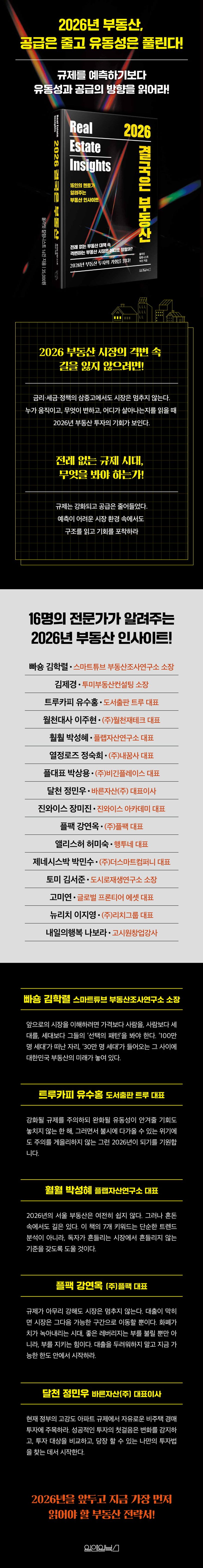 『2026 결국은 부동산』은 각 분야를 대표하는 부동산 전문가 16명이 참여해, 세대·정책·자본을 입체적으로 분석했다. 예측이 어려운 시장 환경 속에서도 구조를 읽고 기회를 포착하고자 하는 이들에게 든든한 나침반이 될 것이다.