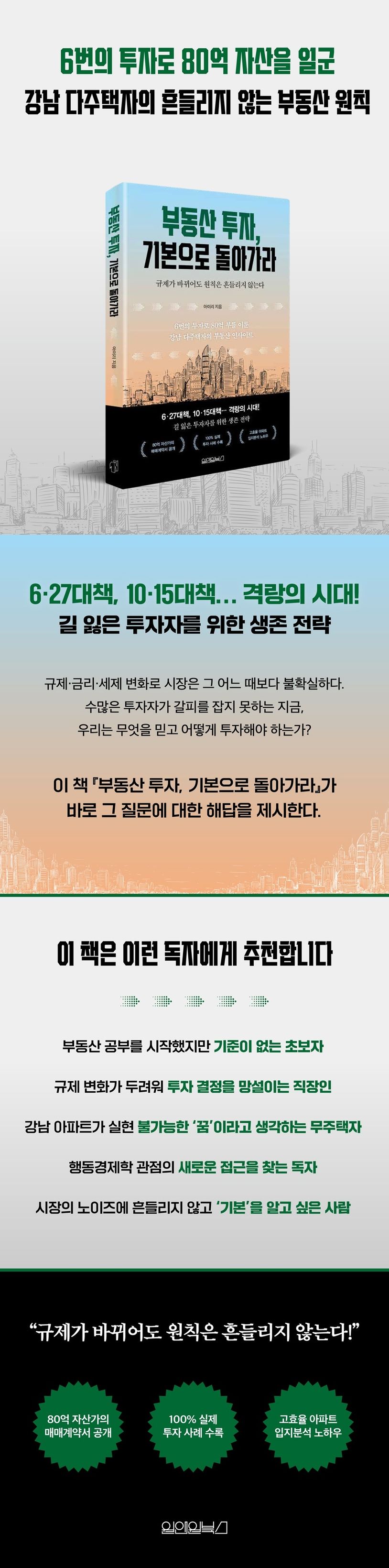서문_이제는기본으로돌아가야한다1장.평범한월급쟁이,부동산에눈뜨다월급으로는원하는아파트를살수없다인플레이션을이기는실물자산6번의투자로일군80억대자산청약에발목잡히지마라경제적자유를위한생각의전환격랑의시대,부동산투자의향방2장.큰돈되는아파트는따로있다입지가시세를만든다임장,하려면제대로하자아파트경사는시세도기울인다고층동향vs.저층남향도대체대단지는몇세대아파트야?커뮤니티시설에서모든것이해결된다오늘은신축이지만내일이면구축이다역세권아파트의가치는얼마일까?아파트주변에많을수록좋은것은?맞벌이출퇴근이편해야선택을받는다학교와의거리는짧을수록좋다밀어주고끌어주는동료가필요하다결국중요한건강남까지의거리다3장.시장은왜예상대로움직이지않는가?왜지금,행동경제학인가?이제떨어질때가된것같아본전만찾으면다팔아야지똘똘한한채가역시최고야우리집은조금더받아야하지않겠어?이미오를만큼올랐는데더오를까?폭락의시작인가,증여특수거래인가?그때보다1억원이올랐는데사야하나?나의투자프레임은어떤모습인가?회사일도바쁜데언제투자까지하지?나는올해부자가될수있을까?쉽게벌었으니한턱내야지?이정도연봉이면강남으로가도되겠지?