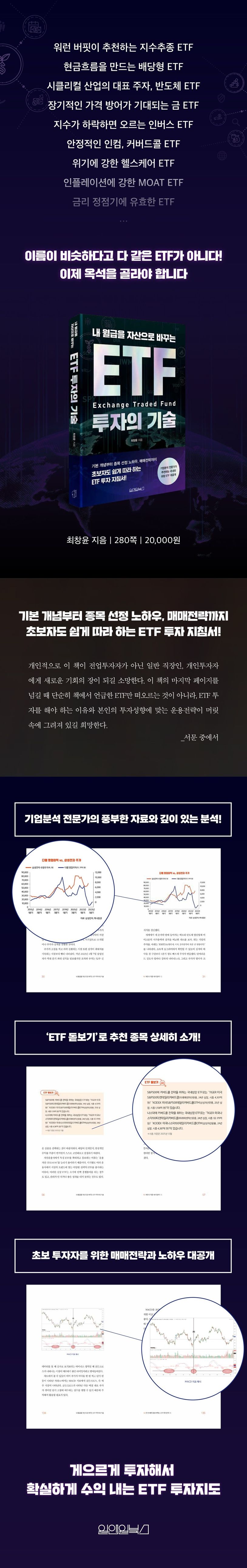 이제 ETF 투자는 ‘무엇을 사느냐’보다 ‘무엇을 걸러내느냐’가 더 중요해진 시점이다. 이름만 그럴듯한 ETF, 유행에 편승해 급조된 테마형 ETF에 무작정 투자하는 것은 오히려 개별 종목 투자보다 더 큰 위험을 초래할 수 있다. 수많은 ETF 가운데 장기적으로 살아남을 상품과 그렇지 못한 상품을 구분해내는 안목, 다시 말해 옥석을 가려내는 기준과 전략이 개인투자자에게 절실히 요구되고 있다. 이 책 『내 월급을 자산으로 바꾸는 ETF 투자의 기술』이 필요한 이유다.