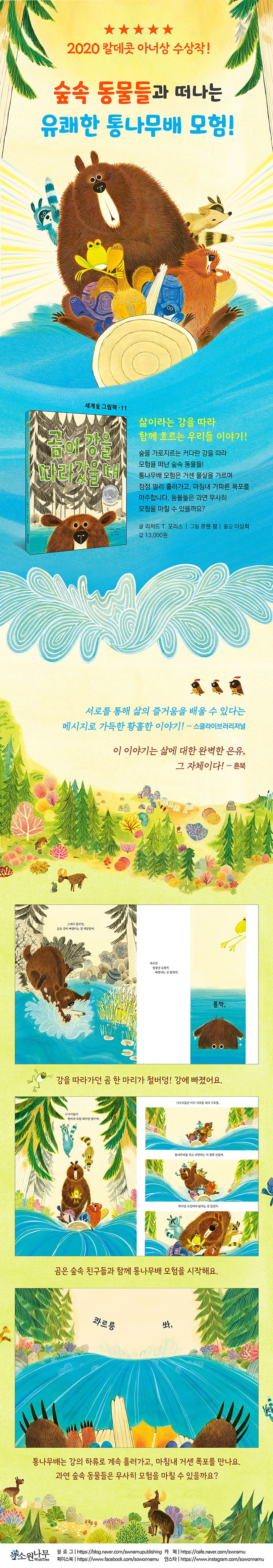 숲을 가로지르는 기나긴 강이 있습니다. 강은 밤에도 낮에도 흘렀지만, 아무도 강이 어디로 흐르는지 알 수 없었습니다. 강 자신조차도 말이지요. 어느 날, 강이 어디로 흐르는지 궁금했던 곰 한 마리가 강을 따라갔습니다. 그러다 철버덩! 강에 빠지고 말았습니다. 통나무배를 타고 강을 둥둥 떠다니던 곰 앞에 개구리, 거북이, 비버, 너구리, 오리가 나타나고, 이후 그들은 앞으로 어떤 일이 닥쳐올지 알 수 없는 모험을 함께하게 됩니다. 그렇게 통나무배는 강의 하류로 계속 흘러가고, 마침내 거센 폭포를 마주칩니다. 강을 따라나선 숲속 동물들은 무사히 모험을 마칠 수 있을까요? 그들은 강 끝에서 무엇을 발견하게 될까요?