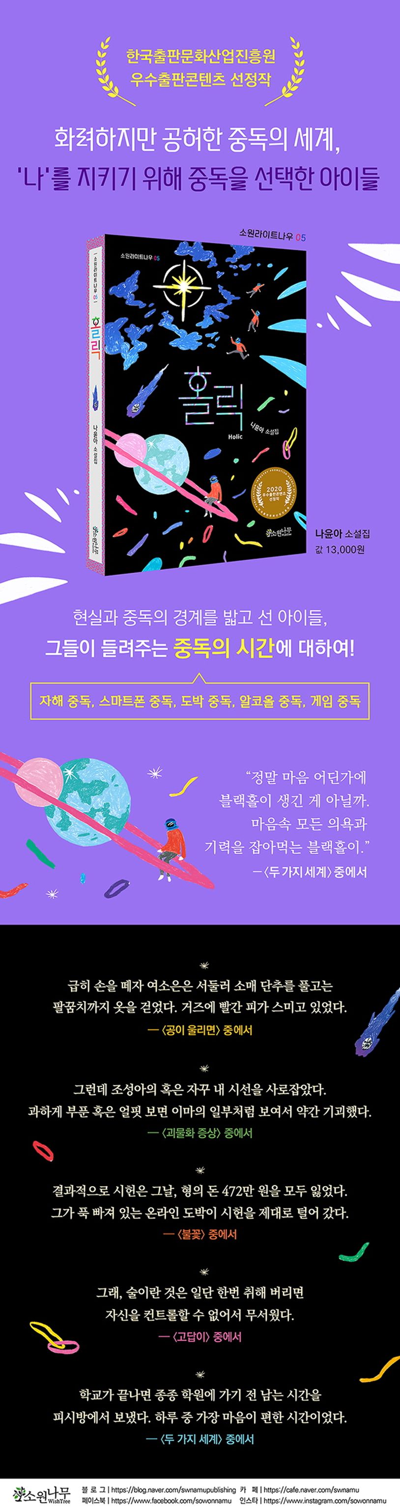 《홀릭》은 자해, 스마트폰, 도박, 알코올, 게임 등 다섯 가지 중독에 빠진 다섯 청소년의 이야기를 다룬 청소년 단편소설집이다. ‘중독’이라는 주제 안에서 다양한 중독의 모습을 살펴보며, 사회가 정해 둔 일방적인 제약이나 금지를 따르기보다 청소년 스스로가 중독에 대해 고민해 볼 수 있는 계기를 마련해 주는 작품이다.