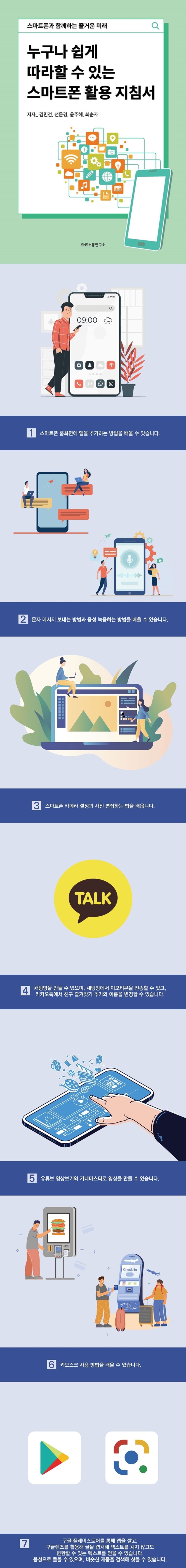 또한, 스마트폰 활용에 서투신 시니어 실버 분들이 보기 편하게 책 크기를 A4사이즈로 하여 글자 크기를 늘려, 편하고 쉽게 따라 하실 수 있도록 하였다. 이 책을 교재로 사용하시는 강사분들께는 수업의 수월성을 마련해 드리고 수강생분들께는 스마트폰 마스터의 길을 열어드리는 길잡이가 될 수 있도록 제작하였다.
