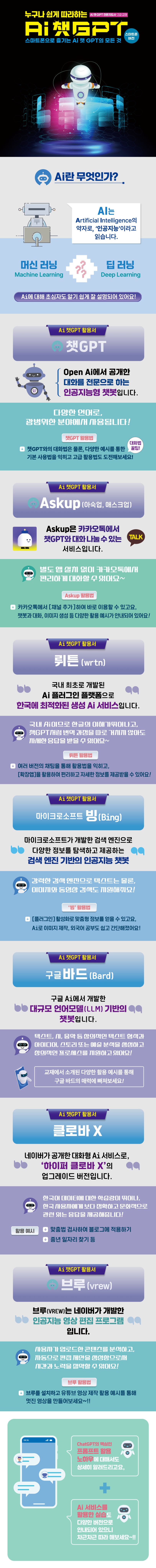 1강AI란무엇인가?Ai의기본개념Ai의주요요소(머신러닝과딥러닝)Ai의역사와발전과정Ai의윤리적문제Ai역기능예방서비스Ai윤리인식제고Ai윤리체험콘텐츠기획챗GPT챗GPT란?챗GPT의기능챗GPT의역사챗GPT모델의원리GPT3.5와GPT4.0의차이대화형Ai서비스생성형Ai서비스2강스마트폰에서하는AI챗GPT서비스★Askup(아숙업)개요및특징장점및단점아숙업친구등록하기아숙업-활용사례아숙업-활용팁3강★OpenAI챗GPT개요및특징장점및단점설치및실행실제사용사례-AI챗GPT는심리상담가-AI챗GPT는건강주치의4강★ChatGPT와의대화시작하기챗GPT가입방법기본적인질문과대답다양한활용예시대화를이어가는꿀팁/구체적으로말하라꼬리를물어라/방을나눠라고급활용법복잡한정보검색노하우언어학습,레시피추천등5강★뤼튼(wrtn)개요및특징장점및단점뤼튼앱설치방법여러버전의채팅AI캐릭터AI앱/추천뉴스부가기능6강★마이크로소프트빙(Bing)개요및특징장점및단점마이크로소프트빙(bing)시작하기음성모드사용하기이미지검색을위한카메라활용하기DELL-E3를활용한이미지제작하기pdf파일자료찾고저장하기원어민과대화하듯회화공부하기7강★구글바드(GoogleBard)개요및특징/장점및단점실제사용사례-기상청에날씨물어보기-이미지로물어보기-이외다양한사례(시니어작가협회)8강★네이버클로바X개요및특징장점및단점실제사용사례-맞춤법검사기능으로블로그에활용하기-중장년일자리찾기(자기소개서작성)-중장년일자리찾기(면접연습하기)9강ChatGPT의핵심인프롬프트활용노하우프롬프트(Prompt)란?프롬프트명령어를작성할때유용한팁(Tip)업종별분야별프롬프트활용노하우실전무료프롬프트치트시트10강AI서비스를활용한실습1아숙업에서자녀및지인한테편지쓰고슬라이드메시지에서영상편지만들기11강AI서비스를활용한실습2챗GPT뤼튼(wrtn)으로시작성하기시영상만들기슬라이드메시지앱으로시영상만들기픽사베이(pixabay)에서무료동영상다운로더하기캡컷(CapCut)에서시가올라가는영상콘텐츠만들기이미지다운받고멋진카드만들어공유하기(Askup)카드만들어공유하기(글그램)12강브루(VREW)개요및특징장점및단점브루(VREW)설치실제사용사례-AI서비스를활용하여브루로유튜브영상만들기13강Ai추천사이트스마트폰에서활용할수있는Ai앱PC에서활용하는AI이미지생성사